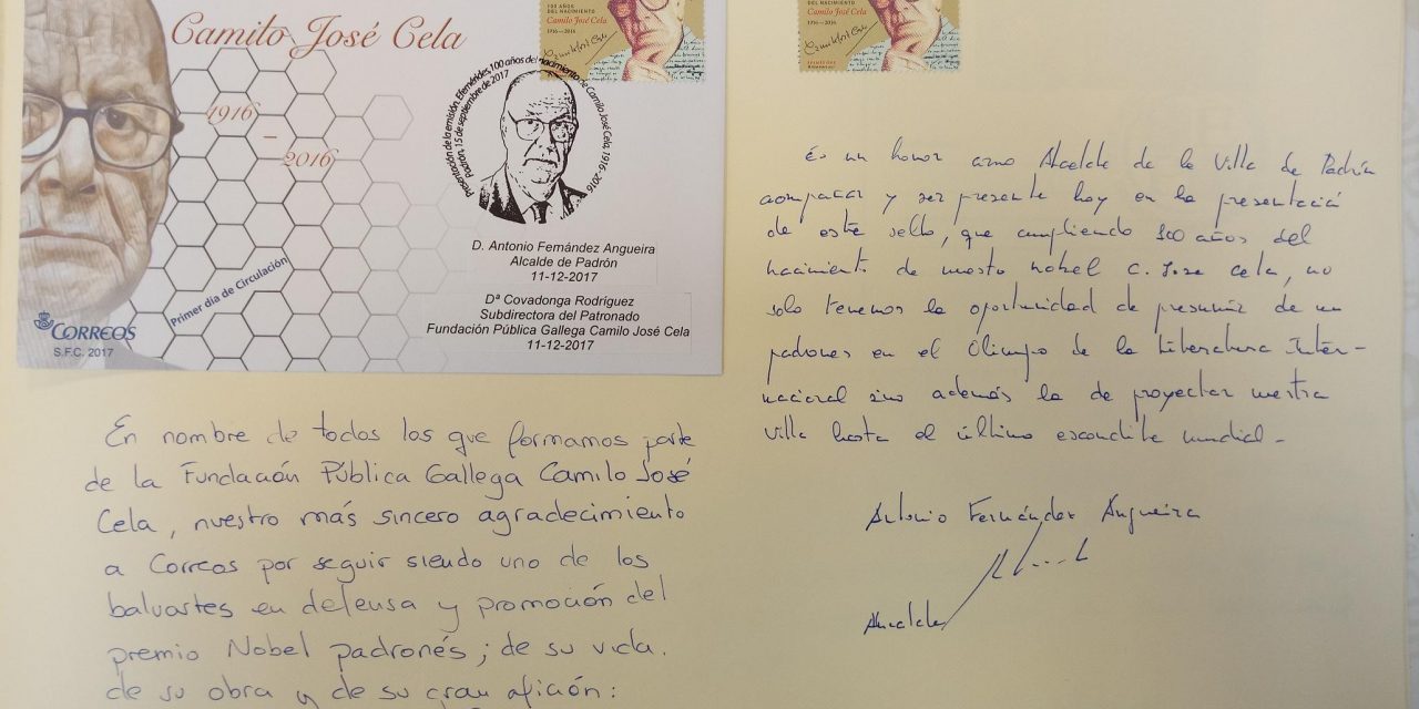 En la dedicatoria unas palabras de agradecimiento del alcalde de Padrón, Antonio Fernández Angueira y de la Subdirectora del Patronato de la Fundación Pública Gallega Camilo José Cela, Covadonga Rodríguez, por la emisión del sello.