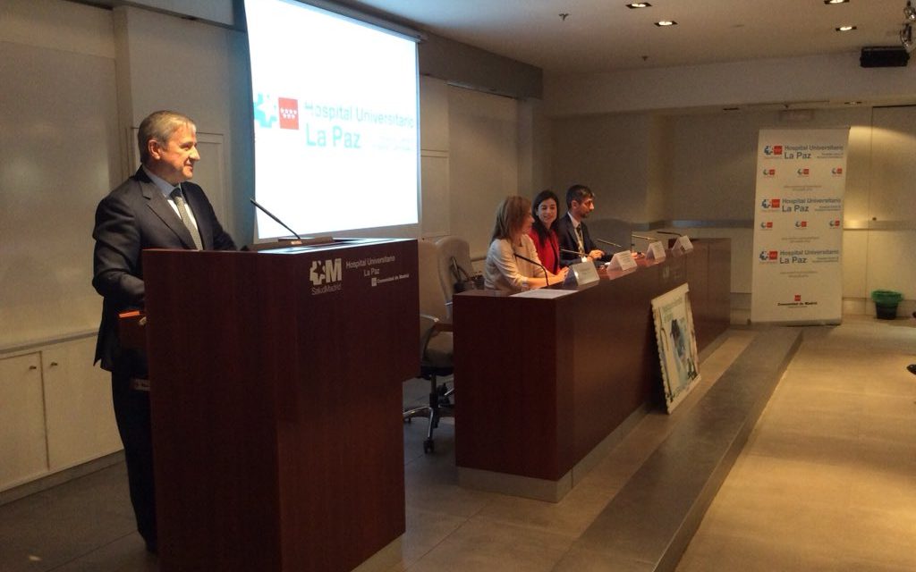 Correos ha presentado en el Hospital la Paz, de Madrid, un sello conmemorativo dedicado a la Investigación Biomédica en España. Al acto de presentación han asistido la Secretaria General Técnica del Ministerio de Fomento, Alicia Segovia Marco, el Director Científico de ldiPAZ, Eduardo López-Collazo, y el Presidente del organismo postal , Javier Cuesta Nuin.