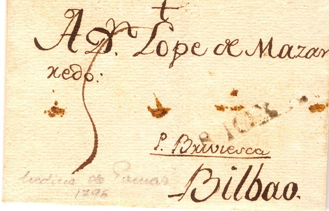 La carta, fechada en Medina de Pomar el 8/7/1796, va dirigida a Bilbao por Briviesca con un porte de 5 cuartos.