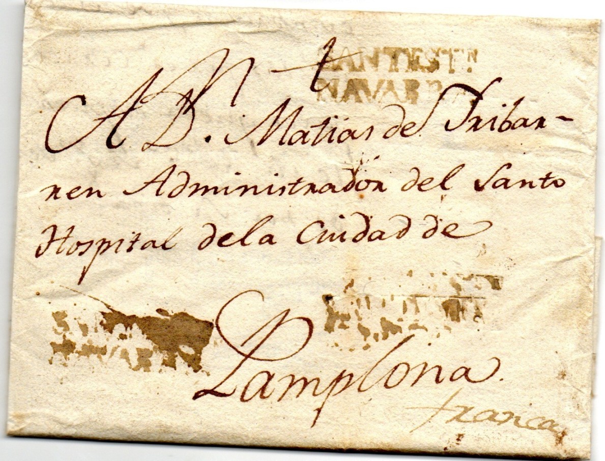 Carta circulada de Santesteban a Pamplona el día 27 de Agosto de 1799. Presenta estampado en tinta de escribir el cuño de origen de la estafeta de Santesteban que Tizón sitúa como nº 1 y en uso entre 1825 y 1845. Bueno pues habrá que retroceder 26 años para situar el inicio de uso de esta marca de cuño. Sin duda se sitúa en el momento, 1799, en que son varias las estafetas navarras que reciben un nuevo cuño bilineal (nombre de la población y la demarcación).