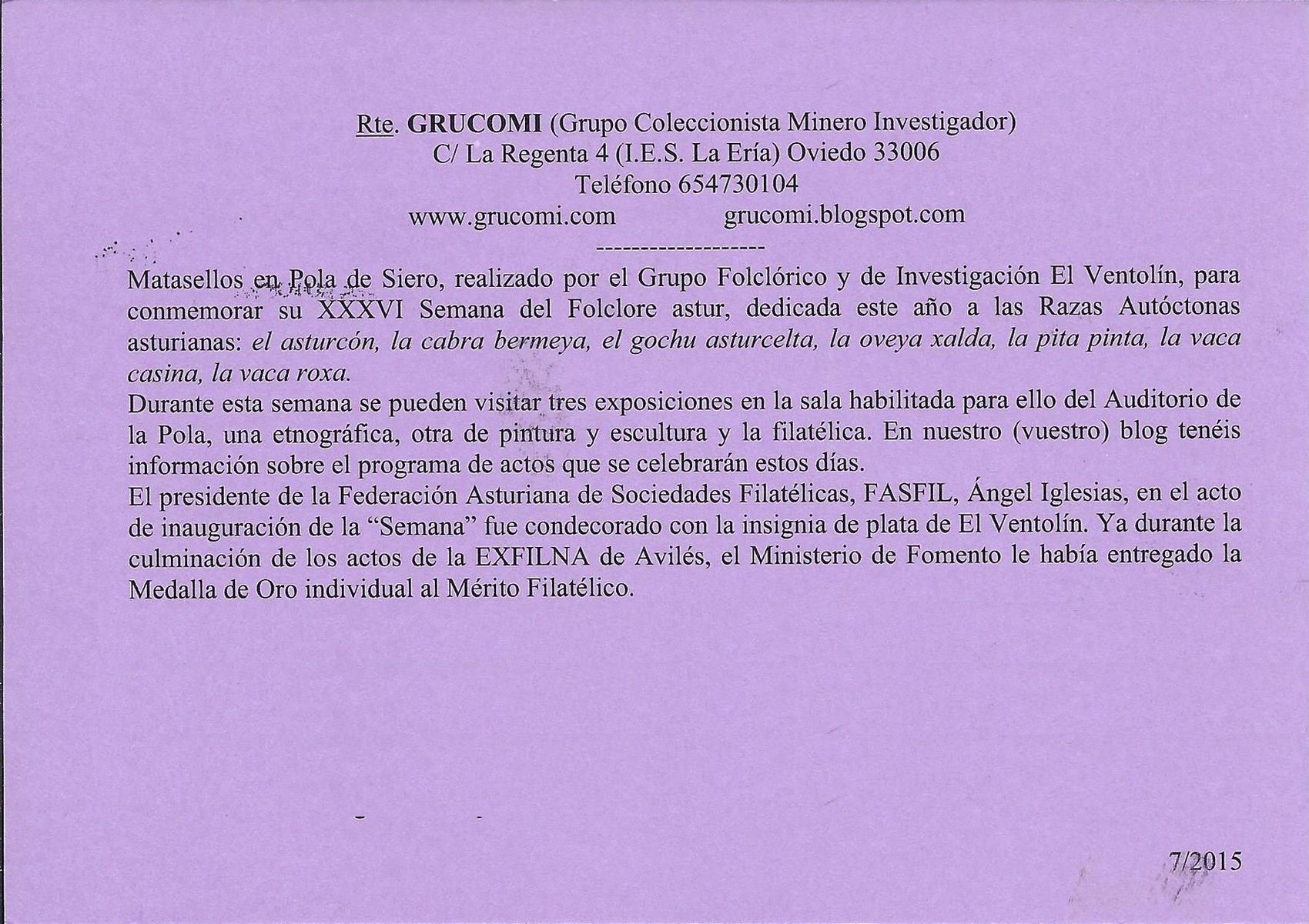 La octava de ellas (7/2015) hace referencia al matasellos utilizado en Pola de Siero el 7 de abril y que había sido solicitado por el "Grupo Folclórico y de Investigación El Ventolín" para conmemorar su "XXXVI Semana del Folclore Astur" y que esté año se había dedicado a las Razas Autóctonas asturianas: el asturcón, la cabra bermeya, el gochu asturcelta, la oveya xalda, la pita pinta, la vaca casina y la vaca roxa (vaca carreñana según el matasellos).