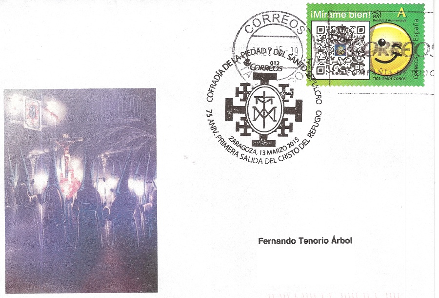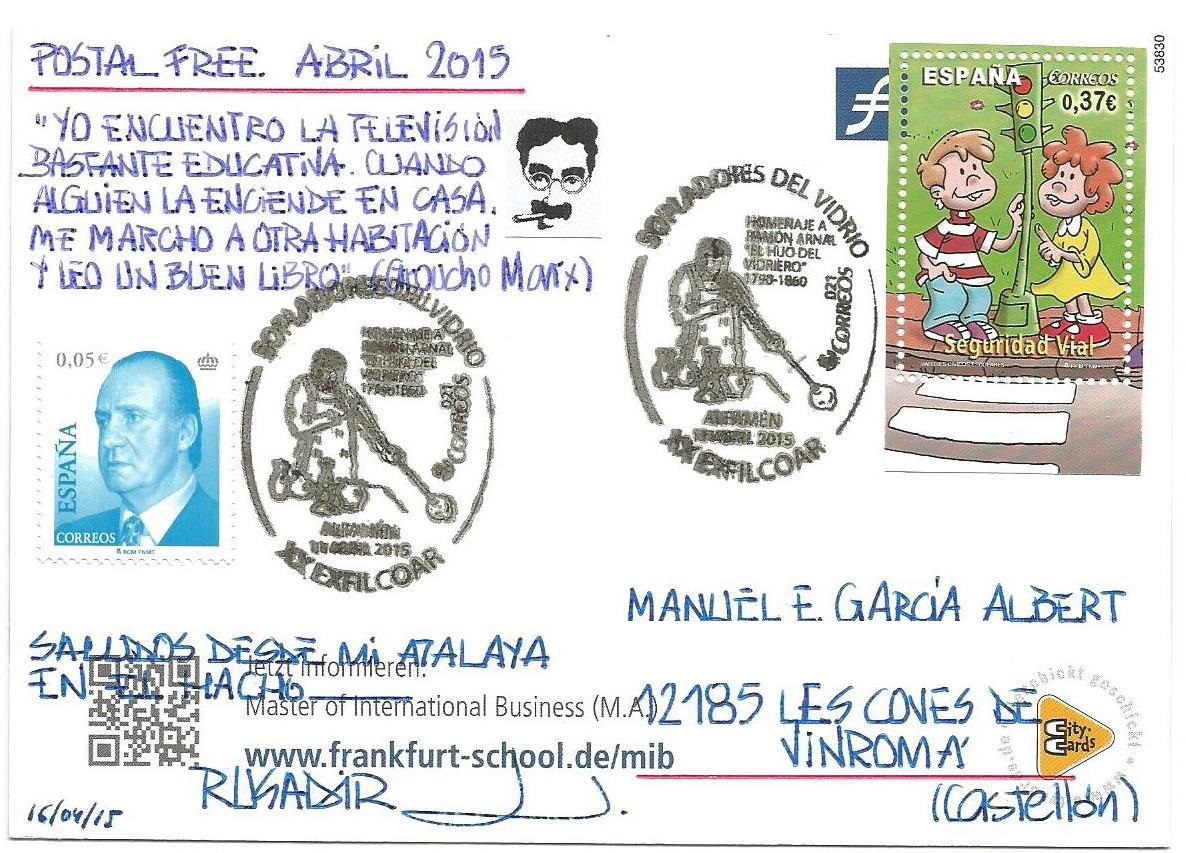 Muestro aquí el matasellos empleado (número 019 de Correos), el anverso de la tarjeta y su reverso.