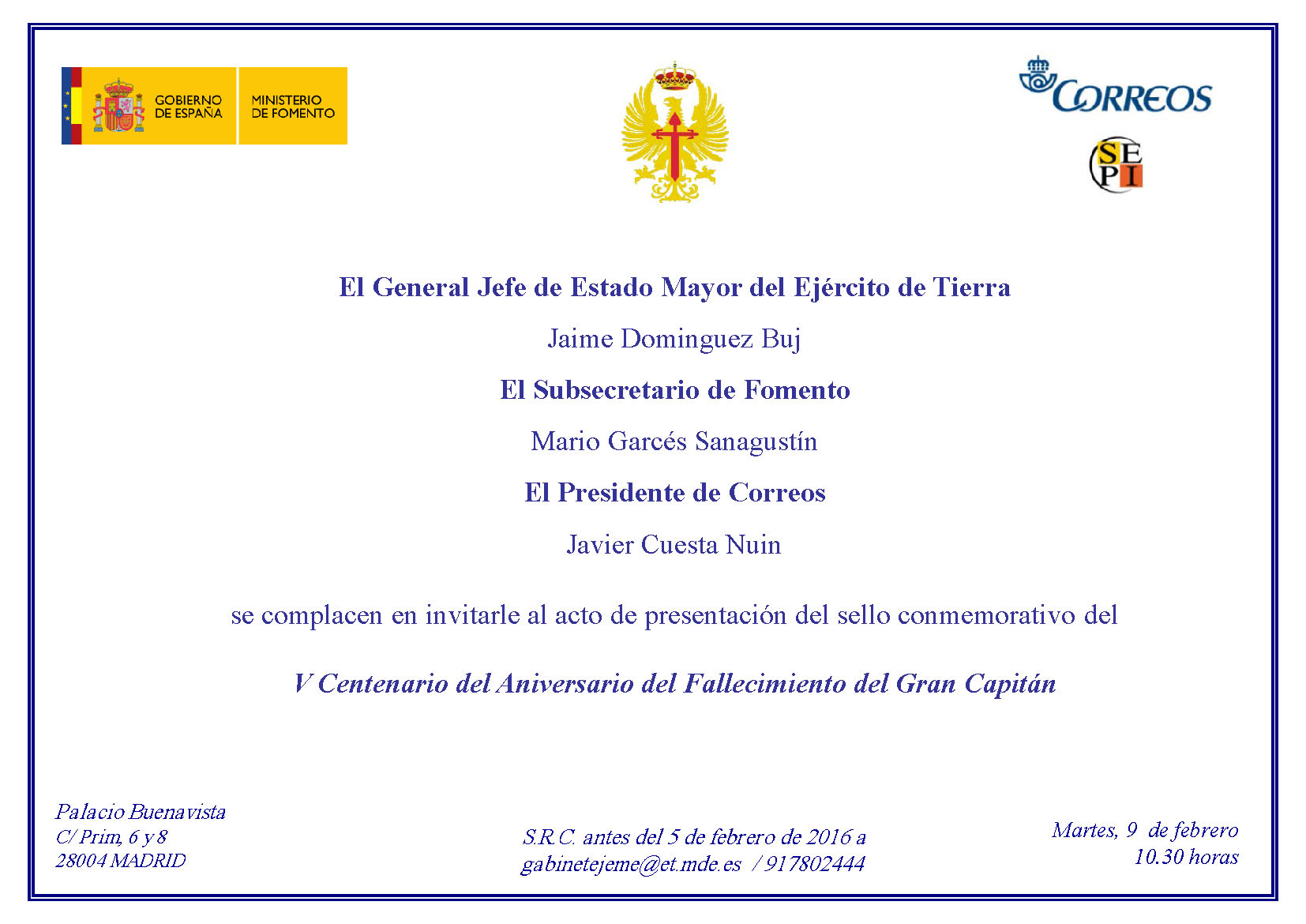 Reproduzco la invitación que, en este sentido, han cursado el General Jefe de estado Mayor del Ejército de Tierra, Jaime Domínguez Buj; el Subsecretario de Fomento, Mario Garcés Sanagustín; y el Presidente de Correos, Javier Cuesta Nuin.