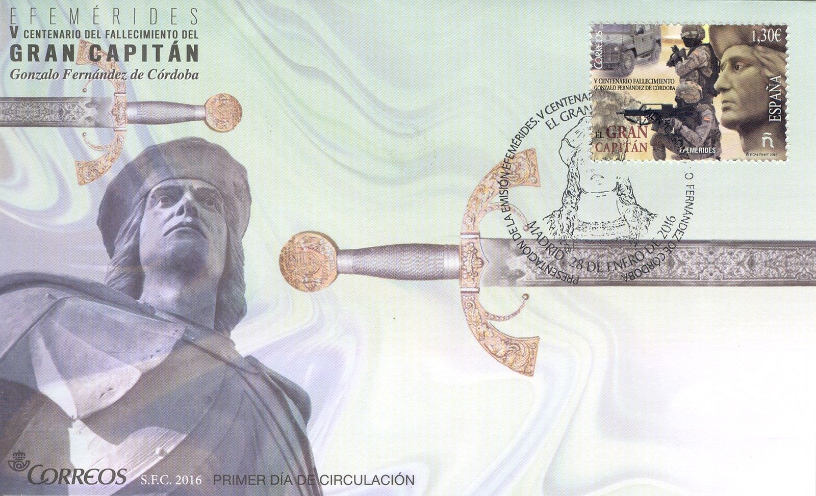 Para conocimiento de todos reproduzco en este mensaje el matasellos y el sobre matasellado relativo a la presentación de la emisión dedicada al "V Centenario del fallecimiento de Gonzalo Fernández de Córdoba. El Gran Capitán", emitido el pasado 28 de enero dentro de la serie de "Efemérides" del año actual, realizada el día de hoy, 9 de febrero, en Madrid.