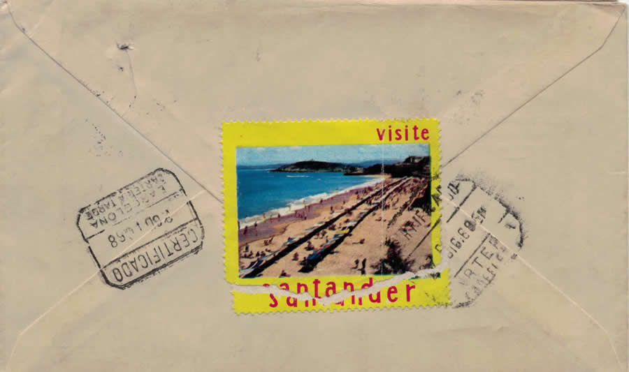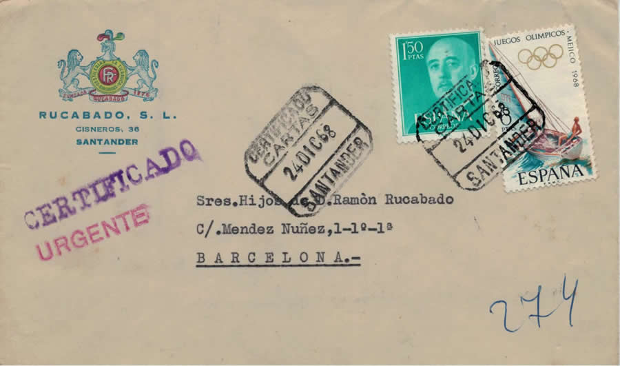 En el frente marcas de CERTIFICADO y URGENTE, los mencionados sellos cancelados con fechador CERTIFICADO CARTAS - 24DIC68 – SANTANDER y anotación del registro. Hasta aquí todo bien. Lo complicado empieza cuando queremos desglosar el montante de un CERTIFICADO-URGENTE: Carta 1,50 ptas. + 2,50 certificado + 5 urgente corriente = 9 ptas. Así pues, certificado urgente no puede ser, para ello faltan 1,50 ptas. Vamos a probar otras combinaciones: Carta certificada 4 ptas. ¡Vaya! Aquí sobran 3,50 ptas. Incrementemos el peso: Carta certificada hasta 50 gr. aquí nos salen 5,50 ptas., sobra 2 pta. Intentemos otra, carta urgente son 6,50, también sobra 1 ptas. En fin, no hay forma.