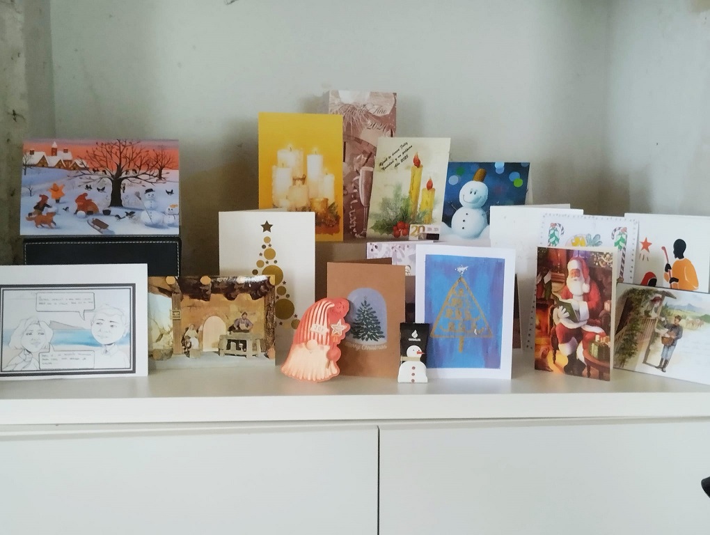 Hola, con la llegada de la preciosa felicitación de Retu, tanto en sobre de verdadero arte postal, como el contenido, se da por concluido el evento, hice una foto con lo recibido en un mueble provisional que me están acabando los ebanistas.
