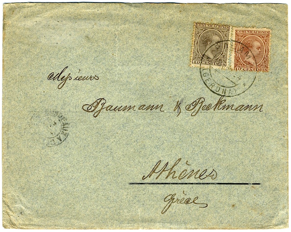 Quisiera mostraros dos sobres con un franqueo de 50 céntimos mediante sellos de Pelón de 40 y 10 cts. El primero es una carta de 1898 certificada de Sevilla a Ginebra (25 cts la carta simple más 25 cts el derecho de certificado). El segundo, con franqueo igual, de Palamos (1894) como envío hasta 30 gramos (2° escalón de peso) a Atenas, destinación no común desde España. Espero que os gusten.