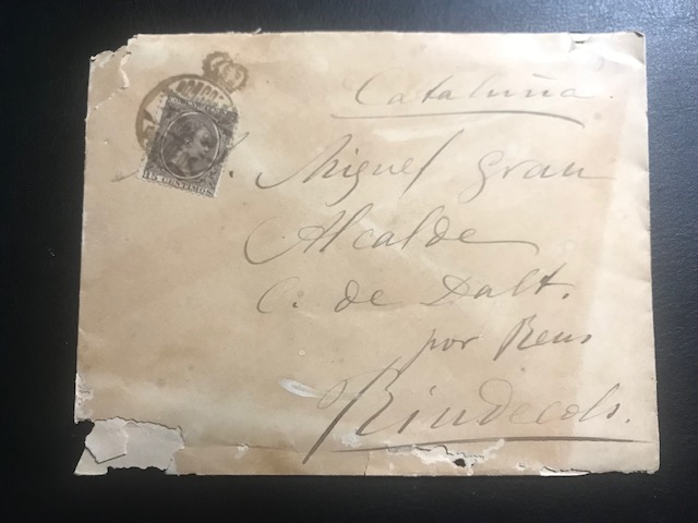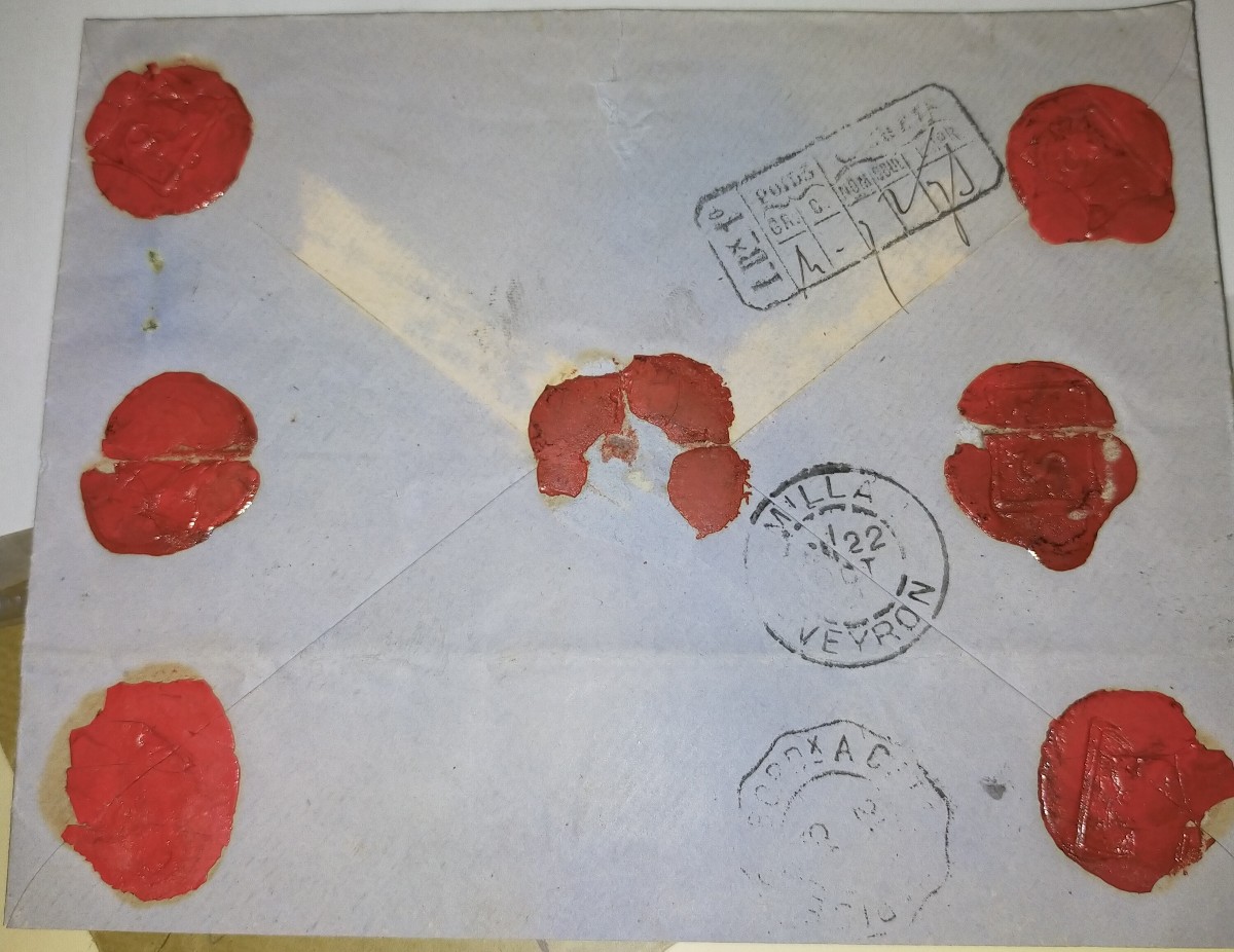 Tiene el aspecto de haber llevada cosida una bolsita de tela conteniendo los cristales o fragmentos del tártaro, posiblemente por la cara del franqueo y que permitiría apartarla levemente para matasellar los sellos.