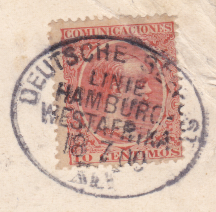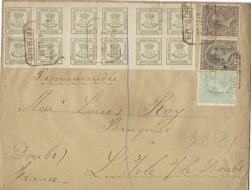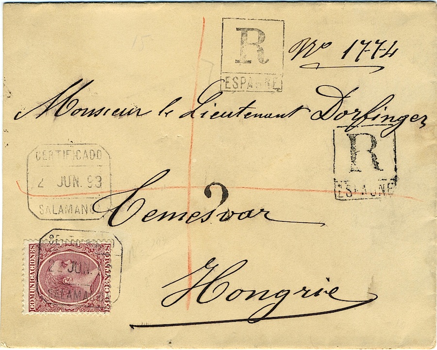 Carta certificada de Salamanca el 22 de junio de 1893 a Temesvár (entonces Hungría, hoy Timișoara en Rumanía; nombre alemán Temeschburg), donde llegó ya el 26 de junio. La pequeña carta, correctamente franqueada con un sello de 50c tipo Pelón hasta 15 gramos de peso, está marcada con una cruz roja así como con dos marcas R-ESPAGNE diferentes para el tráfico internacional como correo certificado. La marca R inferior, ya bastante desgastado, fue introducido en 1879; la marca R superior, más nuevo, con la "R" modificada, está todavía "rociado" –el empleado de la ventanilla probablemente no se había deshecho todavía del sello antiguo y posteriormente lo volvió a estampar "bien". La forma pequeña del matasellos rectangular de certificado con esquinas aplanadas (21 x 20 mm) se empezó a utilizar en España en 1878 y se siguió utilizando en las pequeñas oficinas de correos hasta la década de 1940.