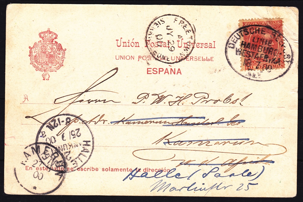 Espectacular tarjeta postal(por lo menos a mi me lo parece) de Las Palmas a Camerún colonia alemana y reexpedida a Alemania.