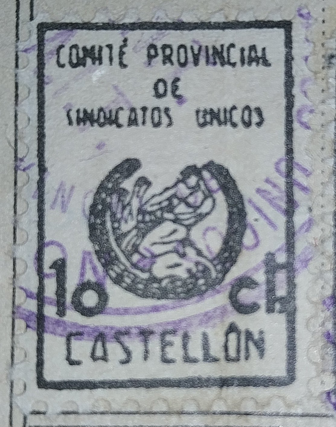 Añado esta viñeta "Comité Provincial de Sindicatos Unicos, Castellón, 10 cts" de un carnet de la C.N.T de Castellón que no he encontrado publicada en el buscador del foro.