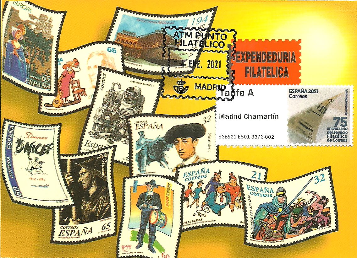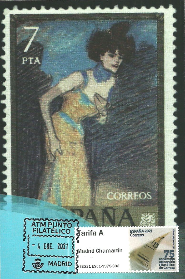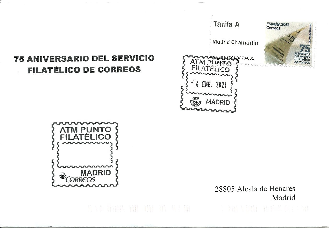 Hoy también han llegado dos de mis creaciones con aspiración máxima que seguro no lo son, pero son bonitas tarjetas. En ambas modelo 75 Aniversario de la creación del Servicio Filatélico, con postales de sellos, pero no el mismo que aparece en el ATM, y matasello con fecha de primer día (4 de enero) exclusivo del Servicio Filatélico para los ATMs.