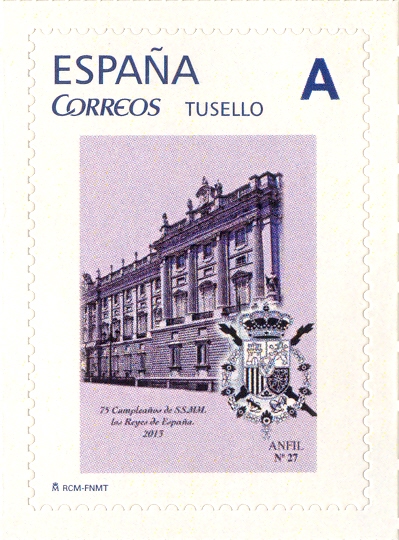 El segundo de ellos hace el número 27 de su colección y se titula: "75 Cumpleaños de SS. MM. los Reyes de España 2013". Por un despiste de Correos, se puede observar que en la cabecera del mismo figura la expresión "75 Aniversario S.S.M.M.".