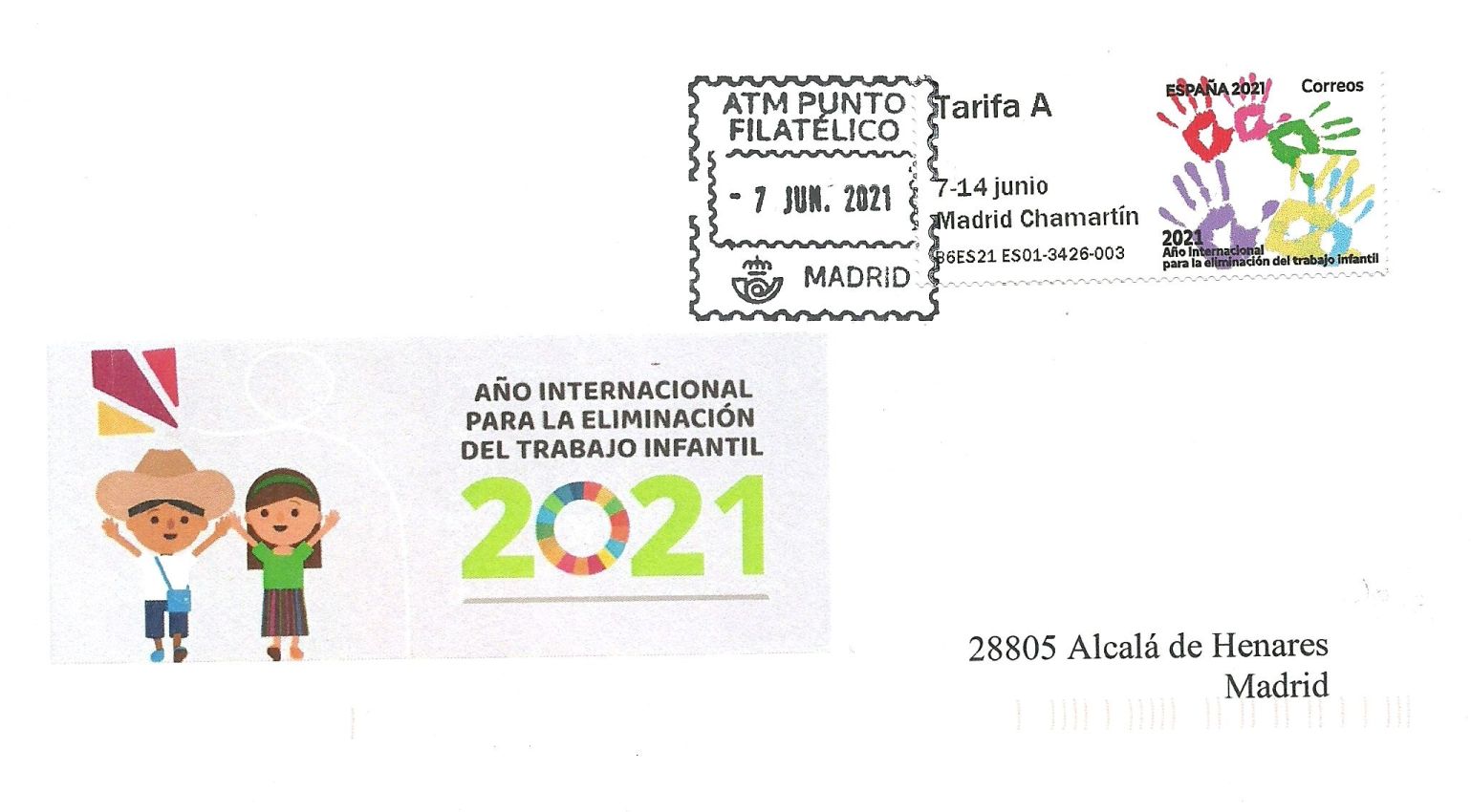 Unos sobrecitos circulados a Alcalá de Henares con el último modelo puesto en circulación, matasello conmemorativo y el nuevo del SF para los ATMs.