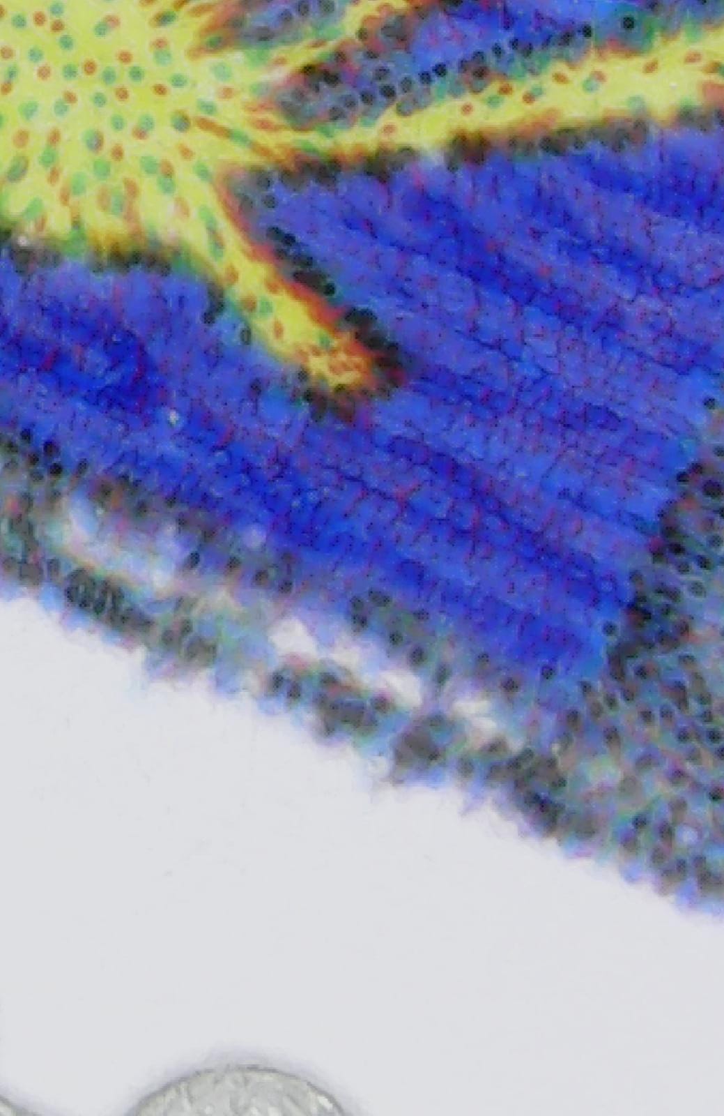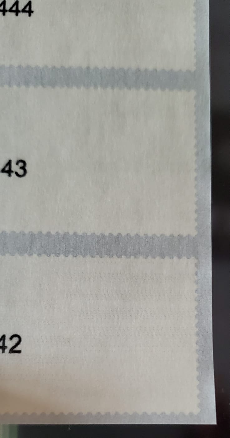 Esta pintura se ha pasado al papel soporte del ATM que llevaría encima. Con lo que me hace pensar que se depositaron después del proceso de impresión normal (inmediatamente después) o bien durante el mismo, pero que al no tener el barniz/laca que lleva la zona del dibujo, hace que sequen más tarde y al enrollarse pase al papel soporte de encima.