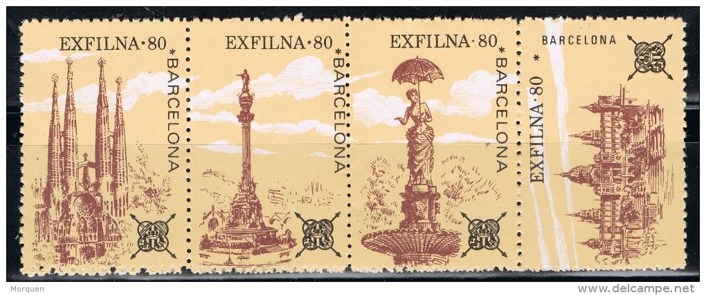Aunque la tira de 5 viñetas de la Exfilna'80 (sin dentar en los extremos) es común, no conocía la disposición en la hoja y la existencia de viñetas sin dentado inferior, hasta que ayer me llegó la que muestro. Obsequio de una buena amiga y destacada filatelista ripollesa.