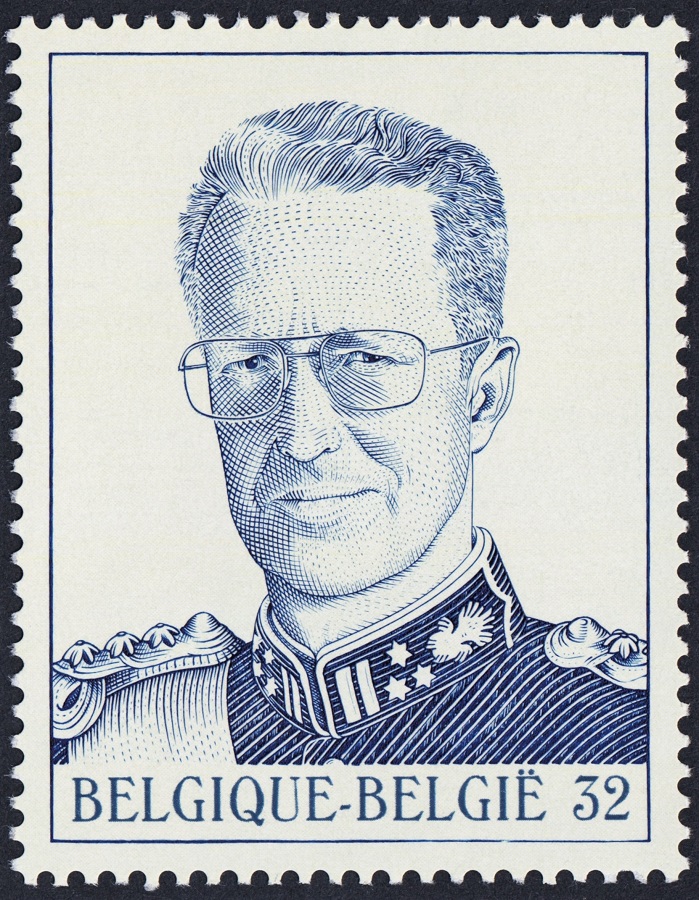 Es imposible recorrer las mejores calcografías de la realeza belga sin reparar en los primeros sellos que aportamos en esta entrada: las emisiones básicas iniciadas en 1936, en cuanto al rey Leopoldo III, y en 1970, la de su hijo y sucesor Balduino. Esta última, reimpresa hasta la saciedad durante una década en casi cuatro decenas de valores grabados, fue diseñada, parca y distanciadamente, por Harry Elström, y resuelta en el acero irreverente, con una talla muy concreta y afianzada, por Charles Leclercqz.