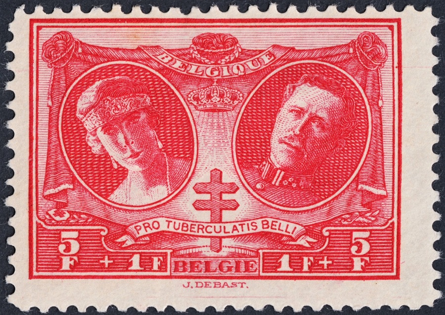 Con posterioridad a esta emisión de 1919, y estos son los sellos que anteceden aquí debajo a éste, De Bast grabó al rey Alberto I en las emisiones de 1926 y 1931; en la primera de ellas, con sobretasa a beneficio de la lucha contra la tuberculosis, junto a la reina consorte Isabel Gabriela. La emisión de 1931, de la que insertamos el sello de 5 francos, constó de un total de 8 valores.