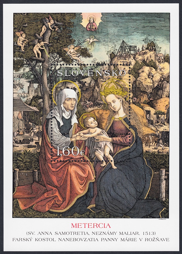 La hojita con la que presentamos formalmente a Horniak es una de sus obras recientes más aclamadas y admiradas. La emisión, impresa mediante calcografía y offset (2011), recrea el panel de la Catedral de Rožňava conocido como Metertia, palabra latina que, literalmente, significa soy la tercera. Hace referencia a la misma narración de la pintura, de la que se desconoce su autoría: Santa Ana, patrona de los mineros, junto a su hija la Virgen María y el Niño Jesús.