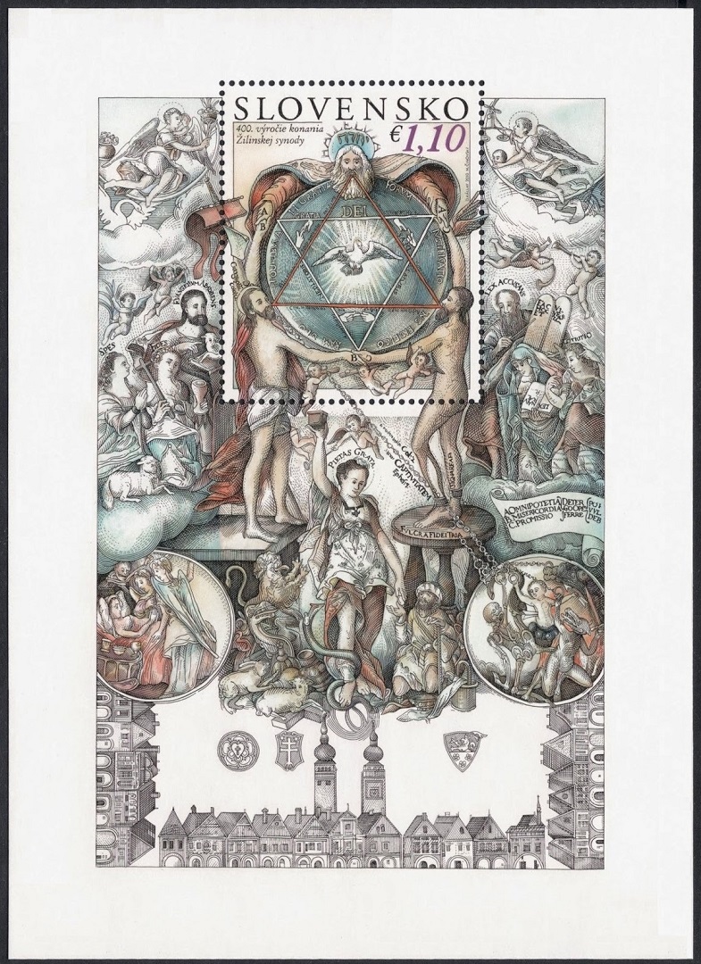 La hojita que abre esta entrada, emitida por Eslovaquia en 2010 para recordar el cuarto centenario del Sínodo de Žilina (1610), e impresa en calcografía y offset, recrea, con gran boato filatélico, la parte central de un retablo que simboliza la consolidación de la conjetura protestante en los albores de la Europa moderna.
