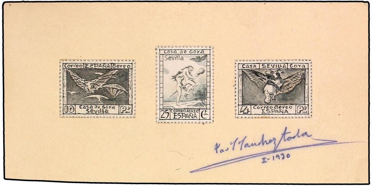 z 1930. PROYECTO A PLUMILLA en cartulina con 3 val. adheridos, uno no adoptado. Firmado Sánchez Toda enero 1930. firma.jpg