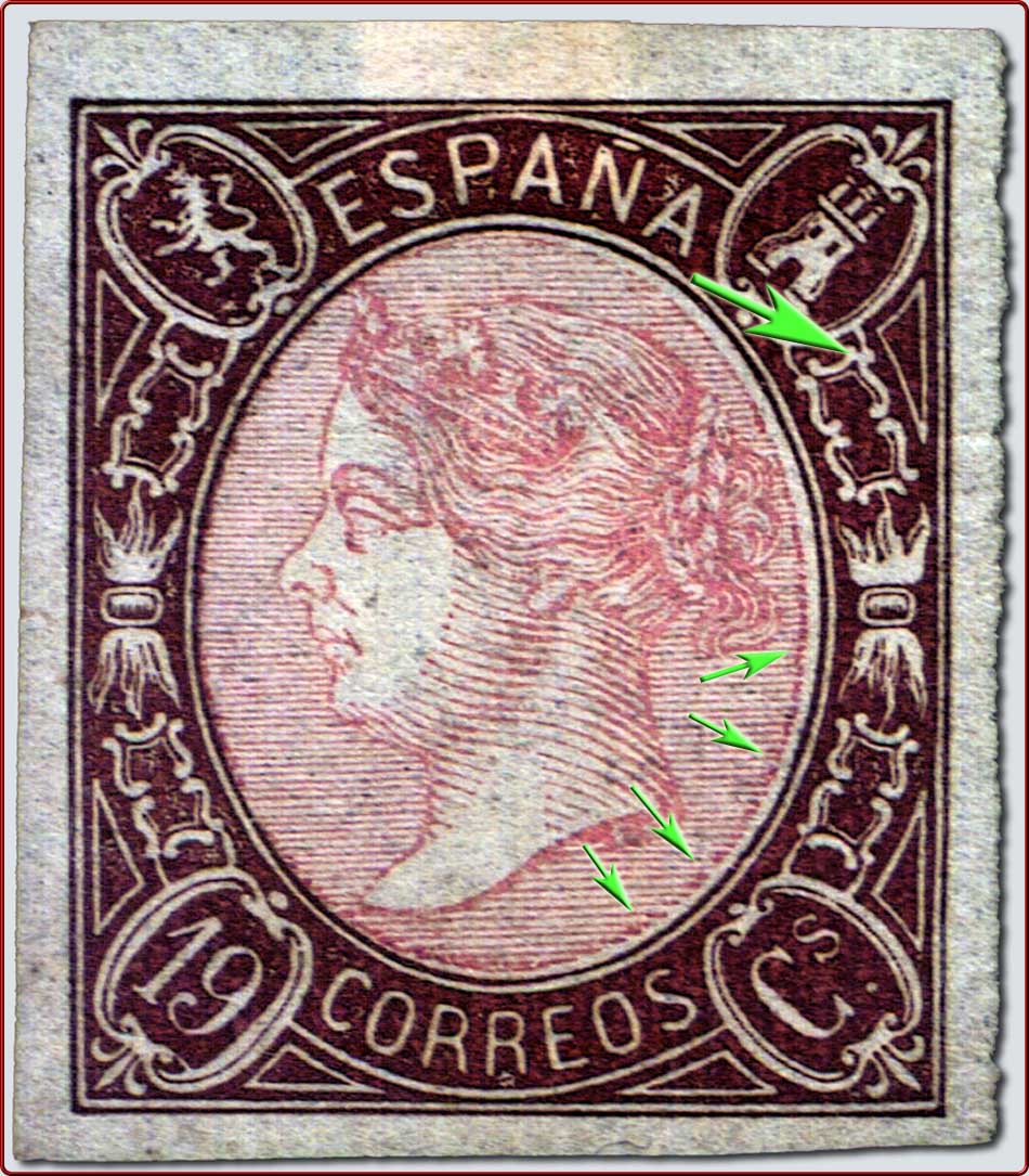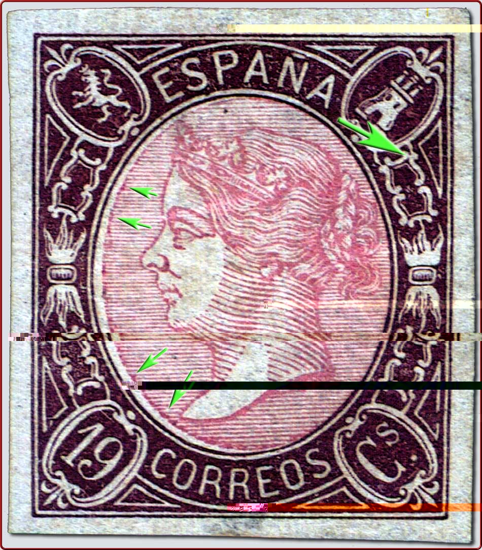 2 - Ninguno de los Sperati que he visto tiene los empastamientos aducidos ... pero sí la rotura ... aunque los dos tipos que hizo este caballerete tienen sus propias caracteristicas de las que carece el sello cuestionado ...