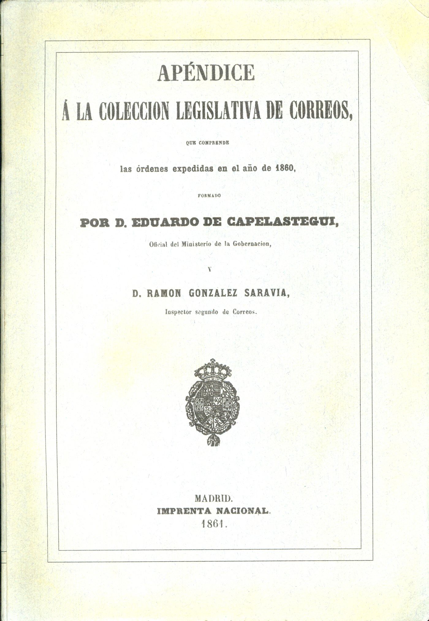 Ilmo. Sr.: la Reina (Q. D. G.) ha tenido a bien mandar que se impriman por cuenta del Estado, bajo la misma forma y condiciones establecidas en la Real orden de 28 de Julio de 1856, mil ejemplares del Apéndice a la Colección legislativa de Correos, formado por Don Eduardo de Capelástegui y D. Ramón González Saravia, y que comprende las disposiciones y órdenes expedidas en el año próximo pasado de 1860. De Real orden lo comunico a V. I. para los efectos consiguientes. Dios guarde a V. I. muchos años. Madrid 21 de Febrero de 1861.=Posada Herrera=Sr. Director general de Correos.