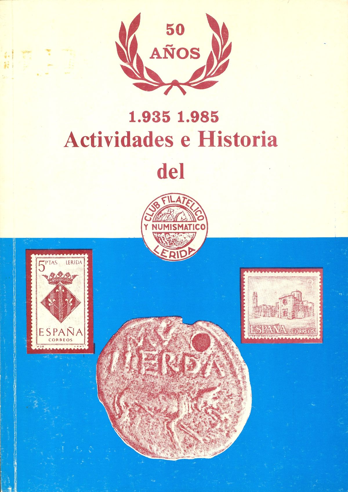 En la cubierta indica: 50 AÑOS. 1.935 1.985. ACTIVIDADES E HISTORIA DEL CLUB FILATÉLICO Y NUMISMÁTICO DE LÉRIDA