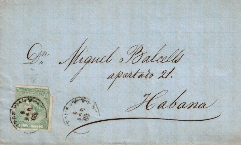 Empiezo con una carta a la Habana con el 10 céntimos del 1866 (esquina rota)