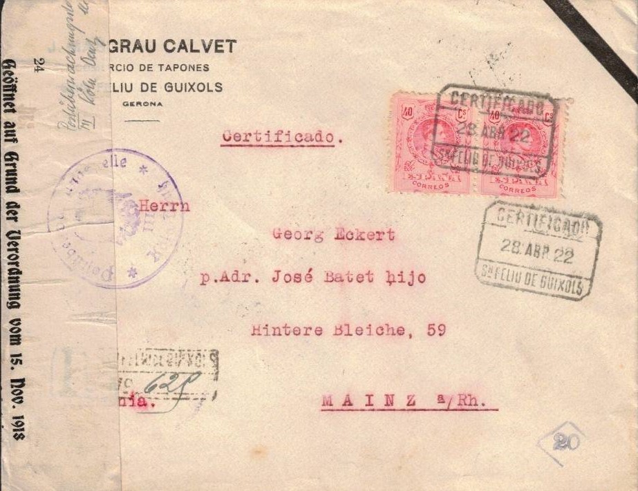 Y termino con carta certificada de San Feliú a Mainz con censura alemana y marcas bien legibles.