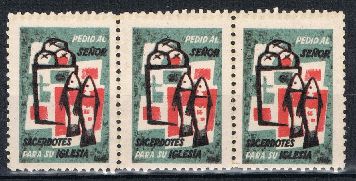 Insistiendo con las viñetas religiosas, las cuales fueron distribuidas por el Seminario Conciliar, decir que las de la HB llevaban un facial en el dorso de 10 céntimos y la viñeta única en pliego de 1 peseta.