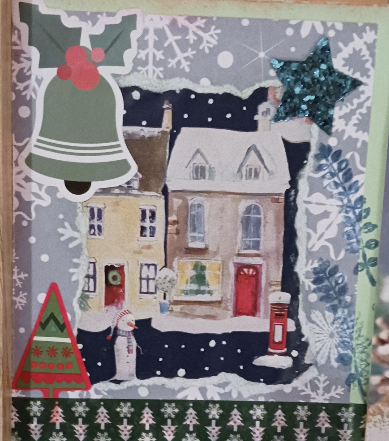 La amiga Asunción envía una felicitación navideña elegante, y llena por dentro de bonitas palabras y detalles simpáticos, como el ángel hecho con recortes de periódico o el árbol acartonado. En cuanto al sobre, es una pieza trabajada, con sus recortes de campanas y estrellas que quieren llenar la casita del fondo, con los detalles del buzón o del muñeco de nieve: destila alegría y colorido por todas partes. (Por cierto la imagen del sobre sale recortada -no veis el sello ni la dirección- porque está tapada con otras postales y ya la tenía puesta en mi "cuadro de honor" del mes... :D