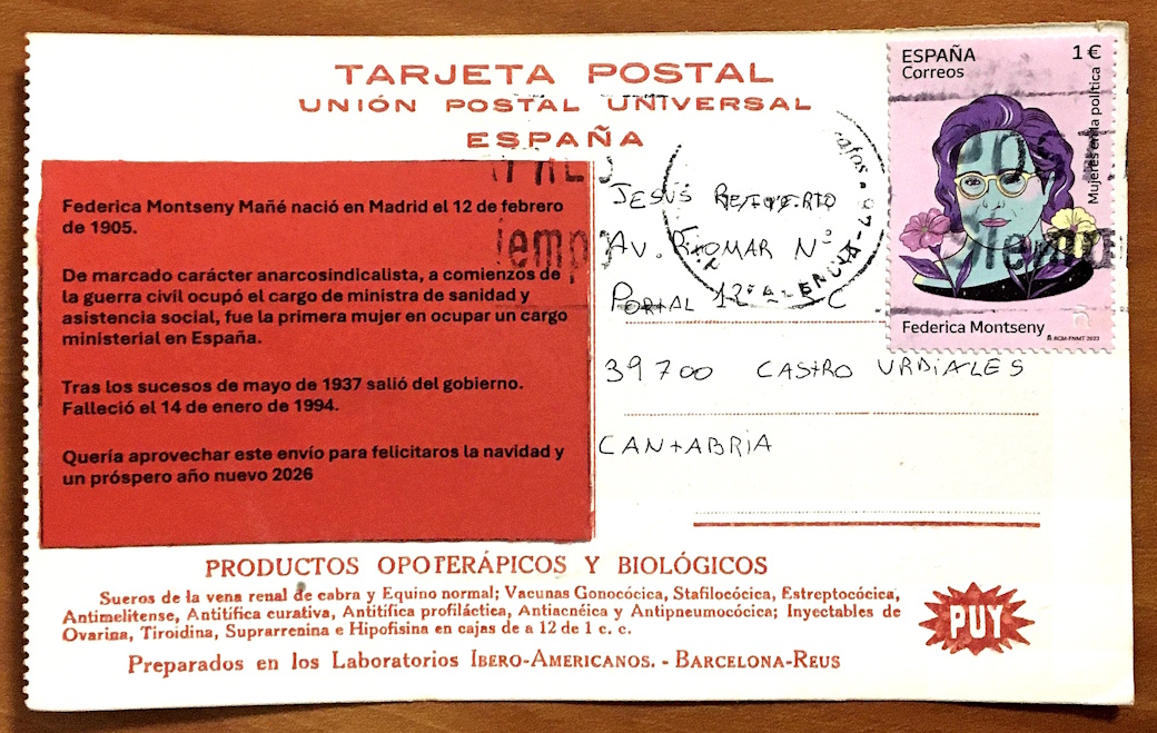 Lo de Raúl sorprende cada vez más :D. He titulado esta serie 'Navidad'25' pero añadiéndole un WTF (What the Fuck) porque, que me aspen si esta no es el christmas más originalque he recibido en mi vida. Una gratísima sorpresa sobre una tarjeta postal prefabricada de ¡productos opoterápicos y biológicos! :roll: dedicada al ¡bacilo del muermo! :lol:, con sello de y dedicatoria a Federica Montseny.