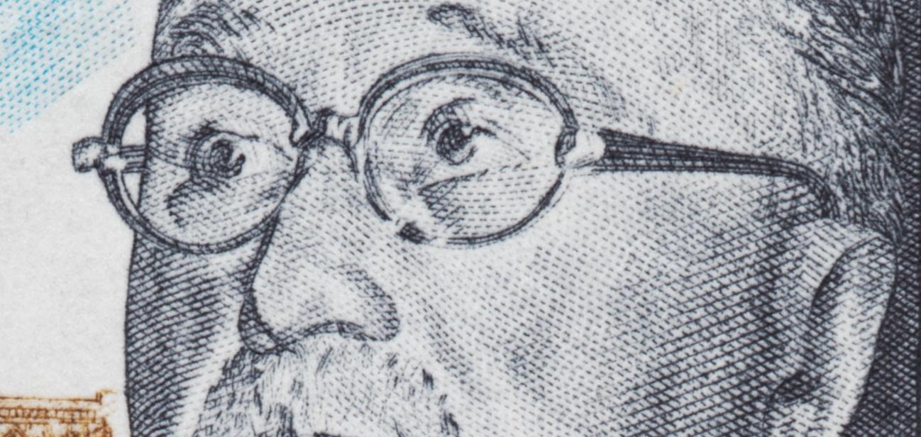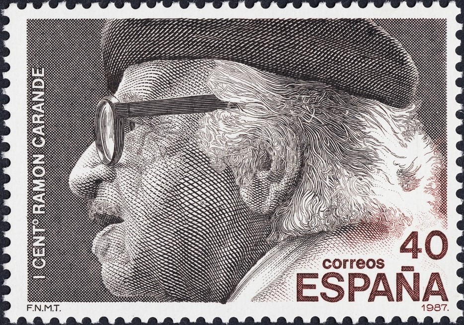 A propósito de haber mostrado este gran sello de Monnet de Antonino Sánchez, recuperamos otro de los más grandes retratos de la filatelia española: el del historiador económico Ramón Carande. Este es un sello expuesto páginas atrás (*), en una de las entradas dedicadas a su autor, Pablo Sampedro Molero, pero al que queremos dar la relevancia visual y el lustre tipográfico que su categoría exige.