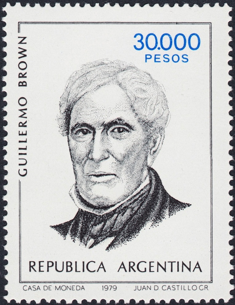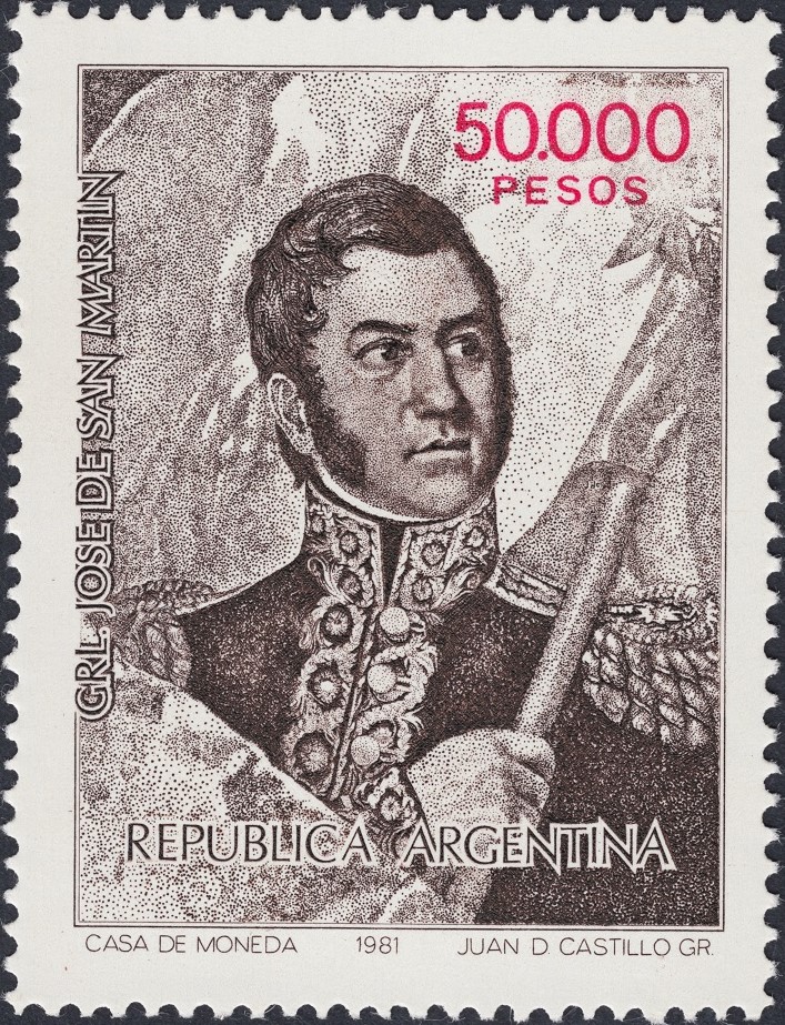 Enseñado el gran sello de Almagro, parece este un buen momento de exponer por fin unos sellos de Argentina de 1984, todos ellos de personalidades eminentes, y que, aunque no emitidos como serie en sentido estricto, sí que son del mismo linaje artístico que aquellos de María Adelma Cabrera que sí mostramos en las primeras páginas de este Tema: los de Simón Bolívar, Manuel Belgrano, el General José de San Martín y Guillermo Brown.