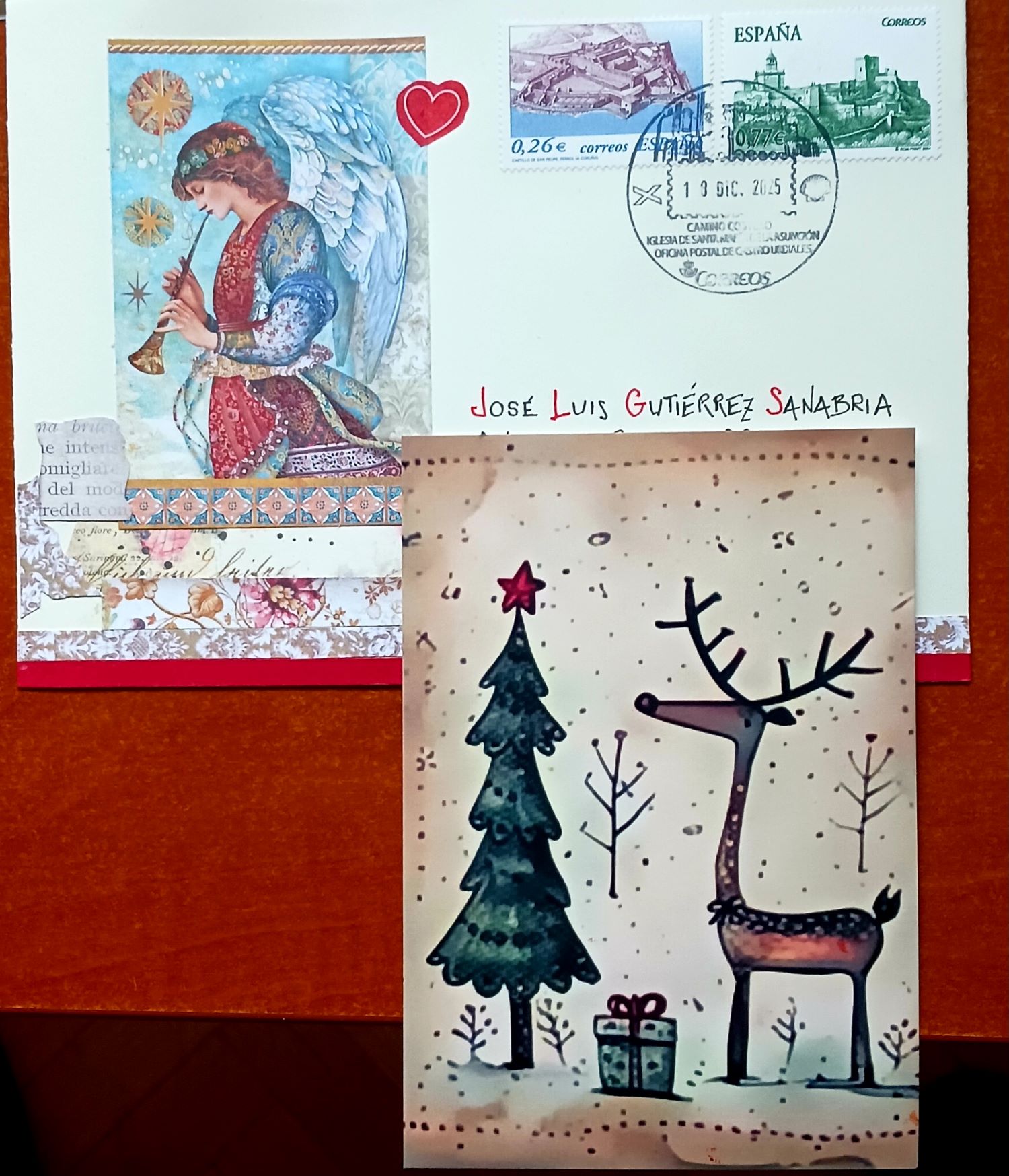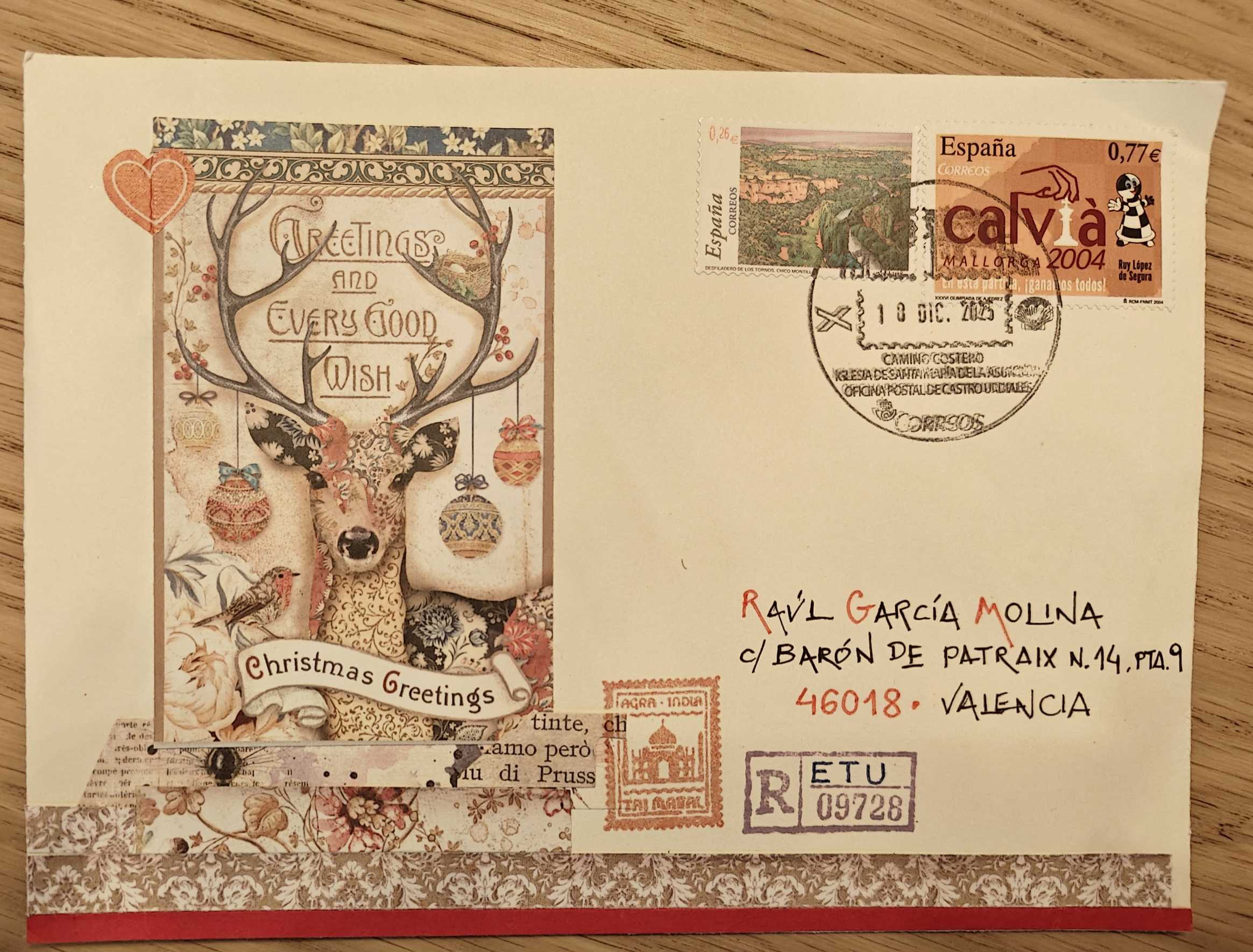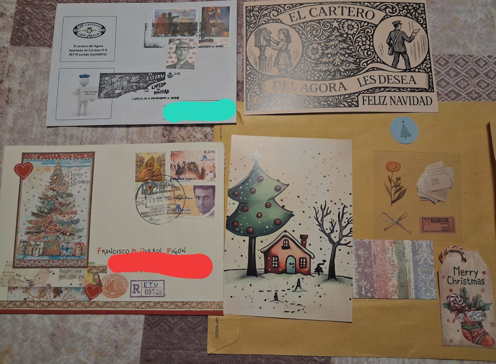 El envío de retu, al límite de la Nochebuena, alegra este buzón tricantino. Y lo llena de Paz con su bonito sobre bellamente decorado, la tarjeta simpática, siempre bien elegida, con esas letras al dorso, elegantes y llenas de cariño. Los regalitos, desbordan alegría! Gracias, amigo.