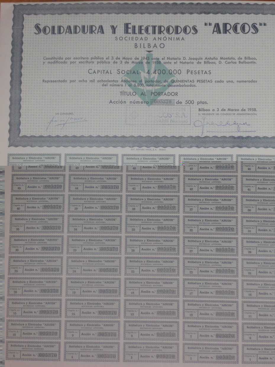 DESCRIPCIÓN: Acción de la empresa Soldadura y Electrodos Arcos S.A. domiciliada en Bilbao en 1958.