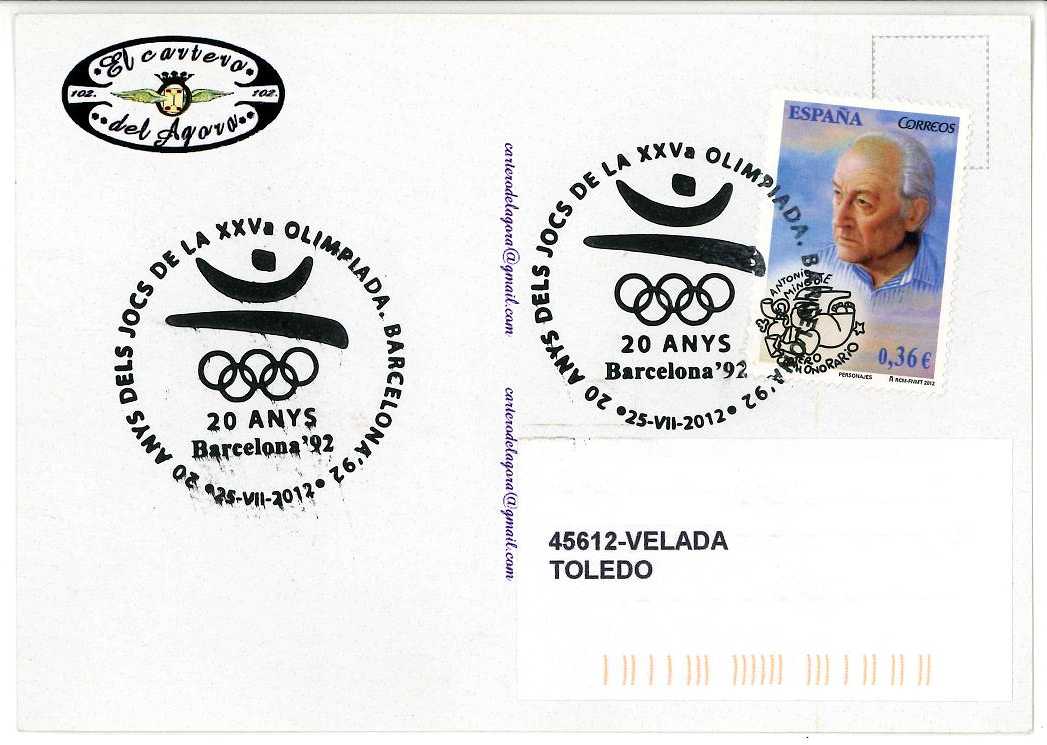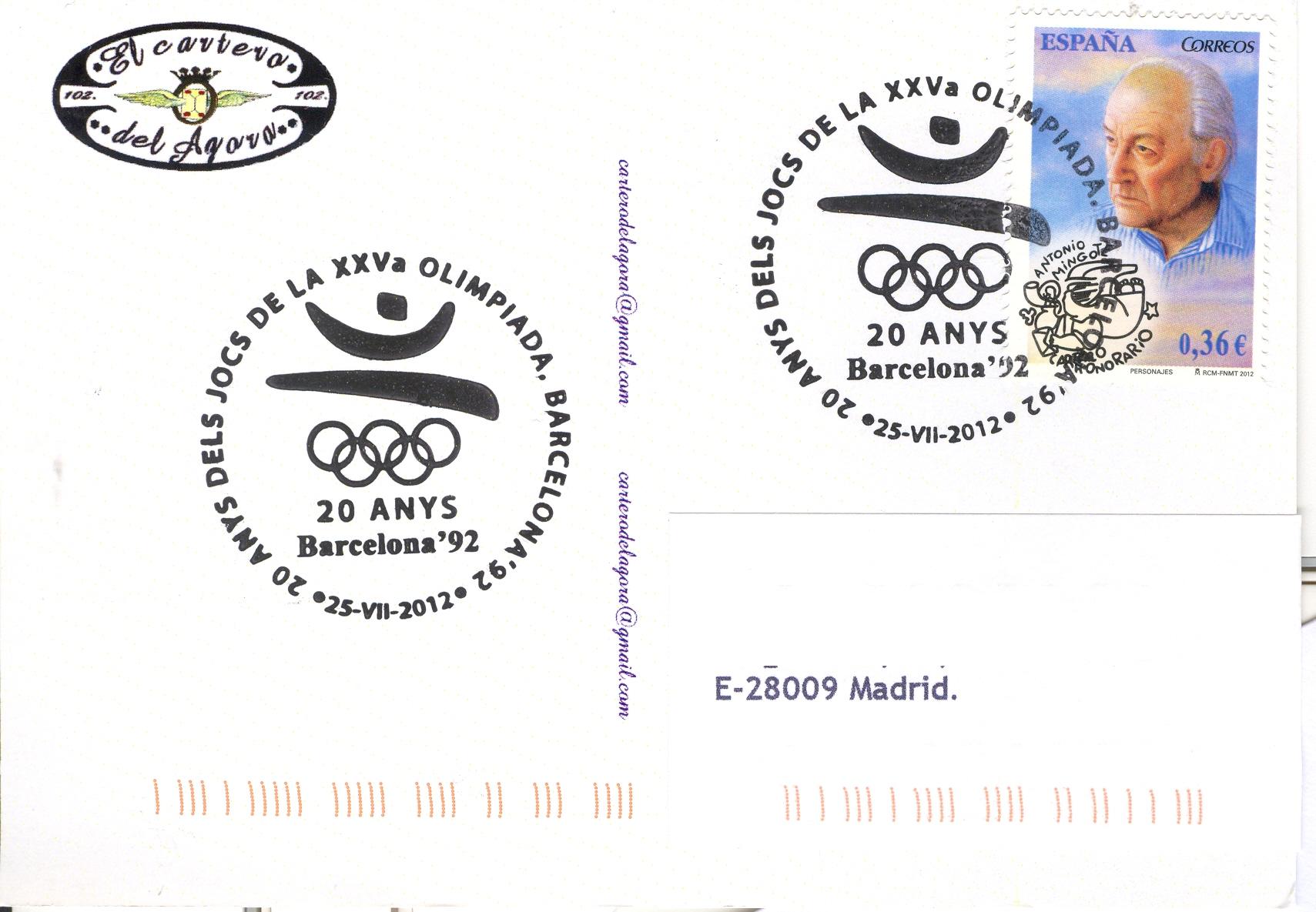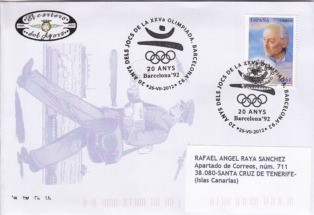 Con fecha de hoy he recibido perfectamente el sobre (con su "Saluda" correspondiente) con el matasellos especial ("precioso") de los 20 ANYS DELS JOCS DE LA XXV OLIMPIADA DE BARCELONA.