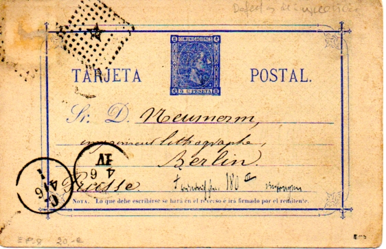 Entero postal (edifil 8 ) de Barcelona a Berlín con raro matasello mudo,y, al dorso, matasello "ESTAFETA DE CAMBIO 1 JUN 78 BARCELONA" muy rara