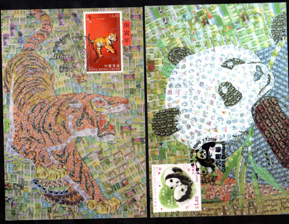 Dos tarjetas máximas de Hong Kong con motivos de fauna: el año del tigre y los pandas gigantes