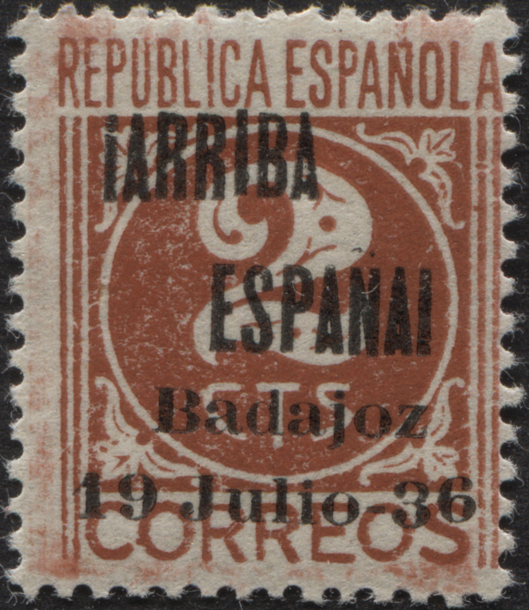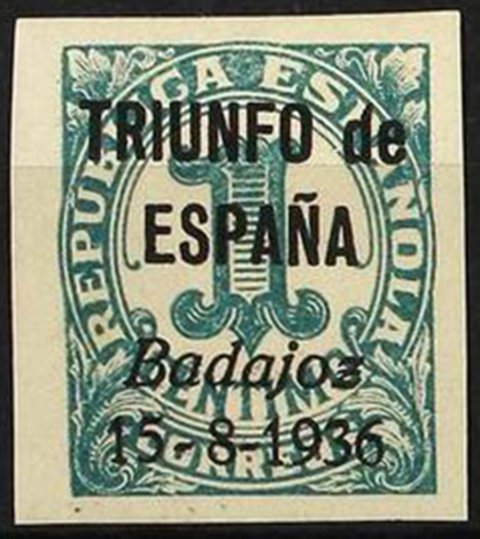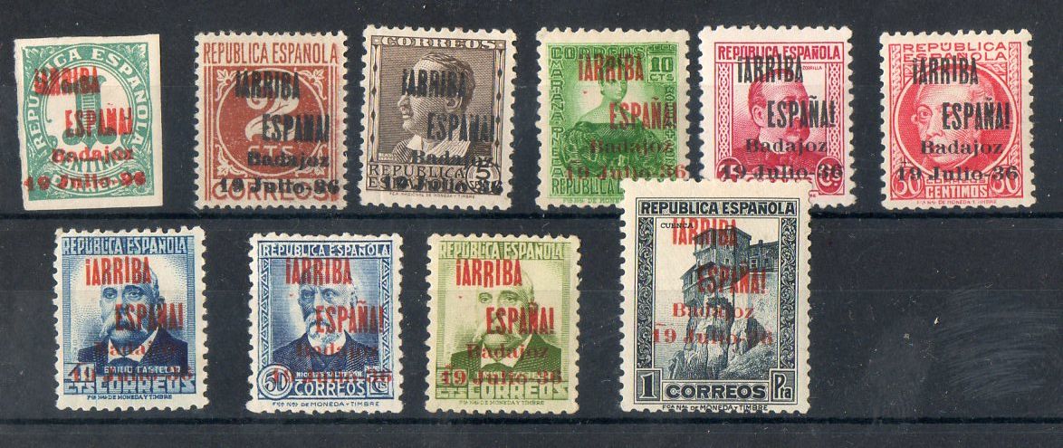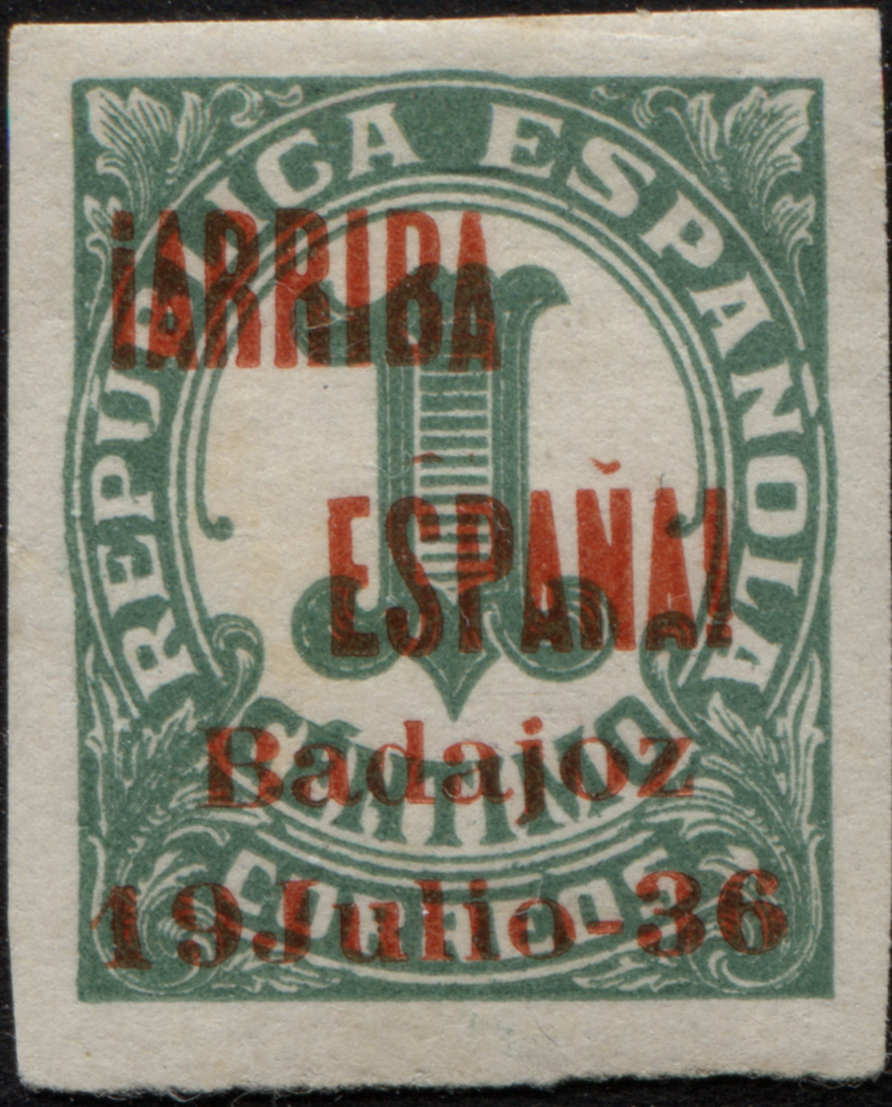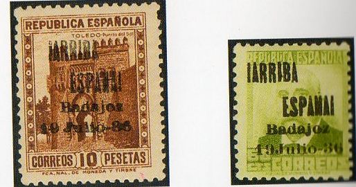 Muestro los que tengo con la sobrecarga ¡ARRIBA ESPAÑA! BADAJOZ 19 DE JULIO 36 (hago esta descripción para futuras búsquedas). Y ahora los tres mas caros de forma individual...por ser más golosos para el falsificador, aunque se falsificaron todos. En principio lo único que saco en claro es la alineación segunda R de ARRIBA y E de ESPAÑA y la notoria separación entre los nº 1 y 9 de la fecha del levantamiento...como razona el santo (nunca te estaremos tan agradecidos por el tiempo que le dedicas a esta afición)