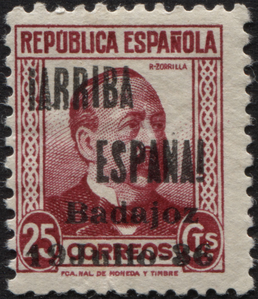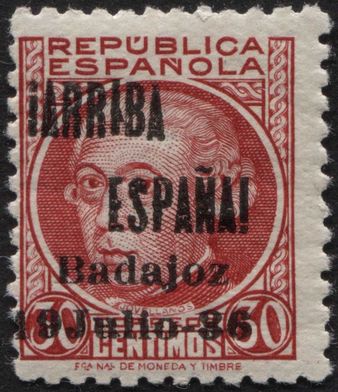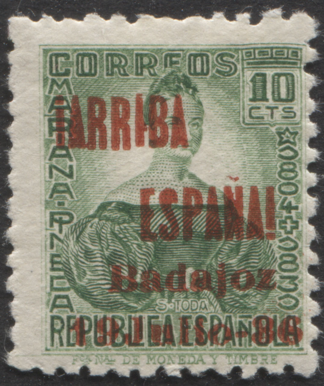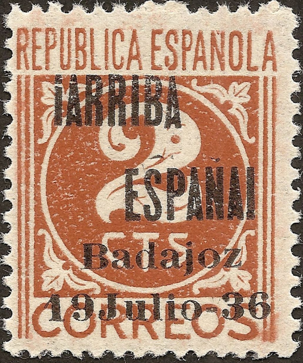 Muestro los que tengo con la sobrecarga ¡ARRIBA ESPAÑA! BADAJOZ 19 DE JULIO 36 (hago esta descripción para futuras búsquedas). Y ahora los tres mas caros de forma individual...por ser más golosos para el falsificador, aunque se falsificaron todos. En principio lo único que saco en claro es la alineación segunda R de ARRIBA y E de ESPAÑA y la notoria separación entre los nº 1 y 9 de la fecha del levantamiento...como razona el santo (nunca te estaremos tan agradecidos por el tiempo que le dedicas a esta afición)