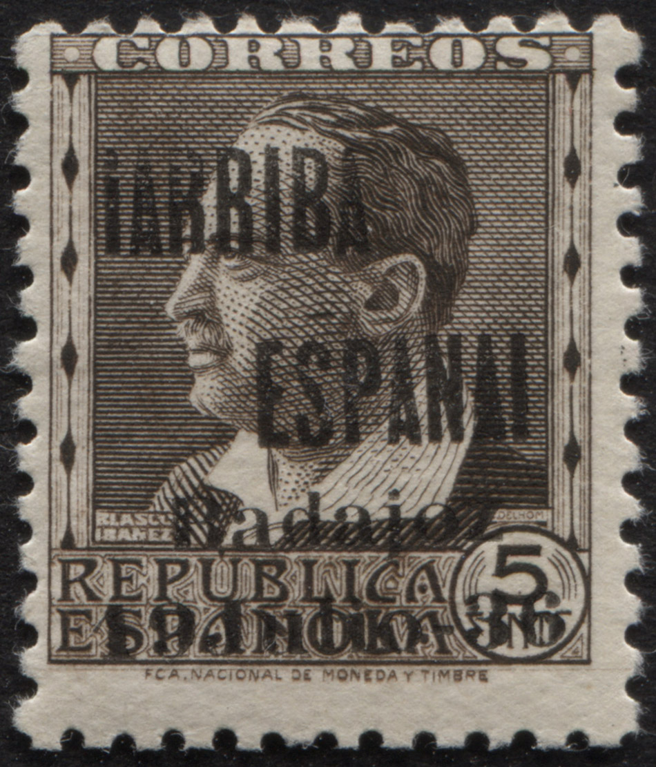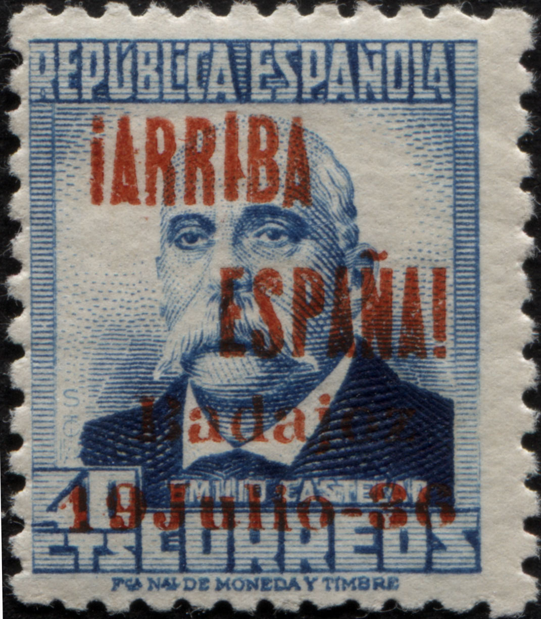Las imágenes que Reigminor ha colgado permiten afinar alguna cosa... Una de las sobrecargas, la que alinea la I con ESPAÑA, tiene un rasgo único, un saliente angular en la I de ARRIBA que la distingue claramente.