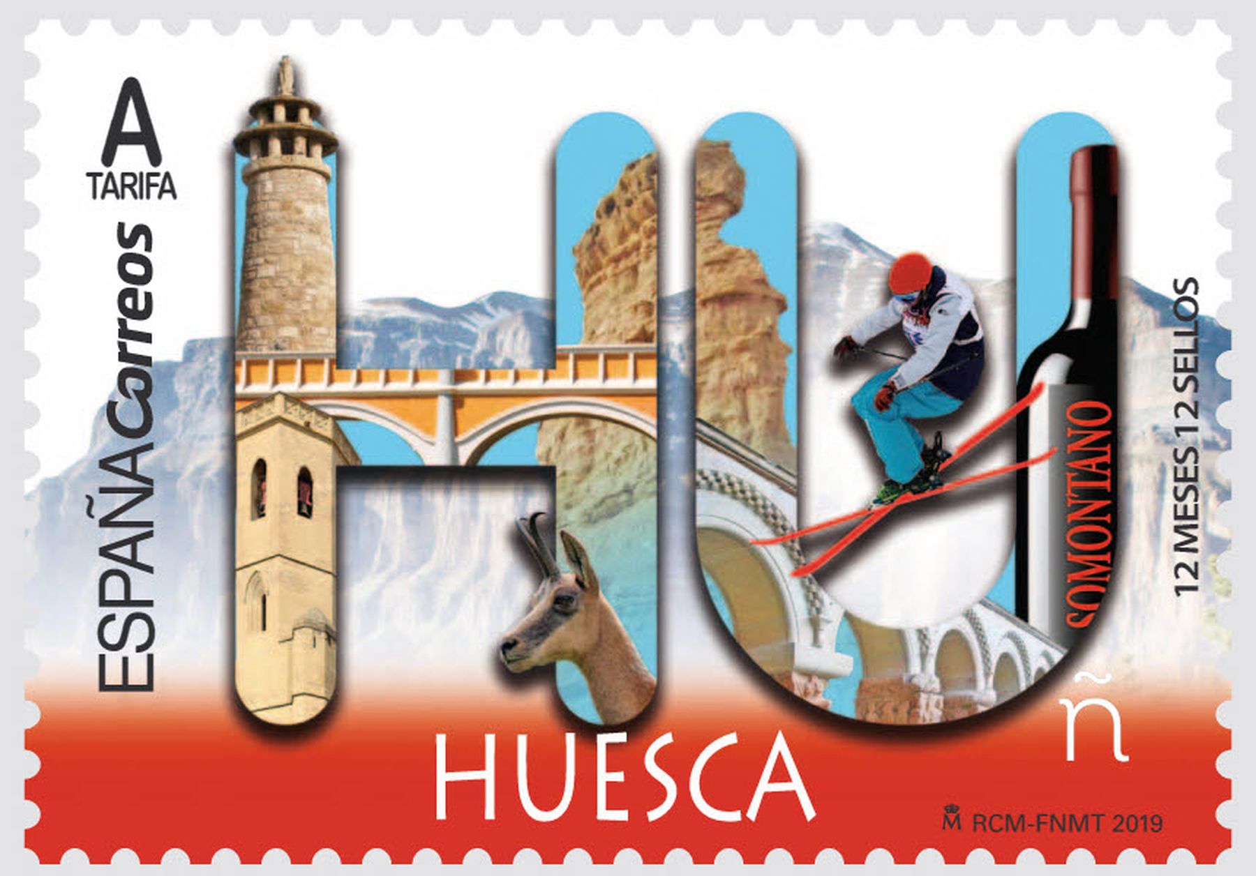 Huesca es la provincia elegida para continuar por tercer año consecutivo con la serie 12 meses, 12 sellos, 12 provincias que Correos inició en 2017. Durante este mes, este sello será utilizado como único tipo de franqueo para todos los envíos que se admitan en las oficinas de esta provincia. Como en años anteriores en el centro del sello aparecen las letras HU, en alusión a las antiguas matrículas de vehículos de España. Huesca provincia que destaca por su envolvente naturaleza con tesoros de arte, cultura e historia en cada rincón que invita a recorrer sus senderos, fundiéndote con el entorno para conseguir una experiencia que se quedará en el recuerdo para siempre.