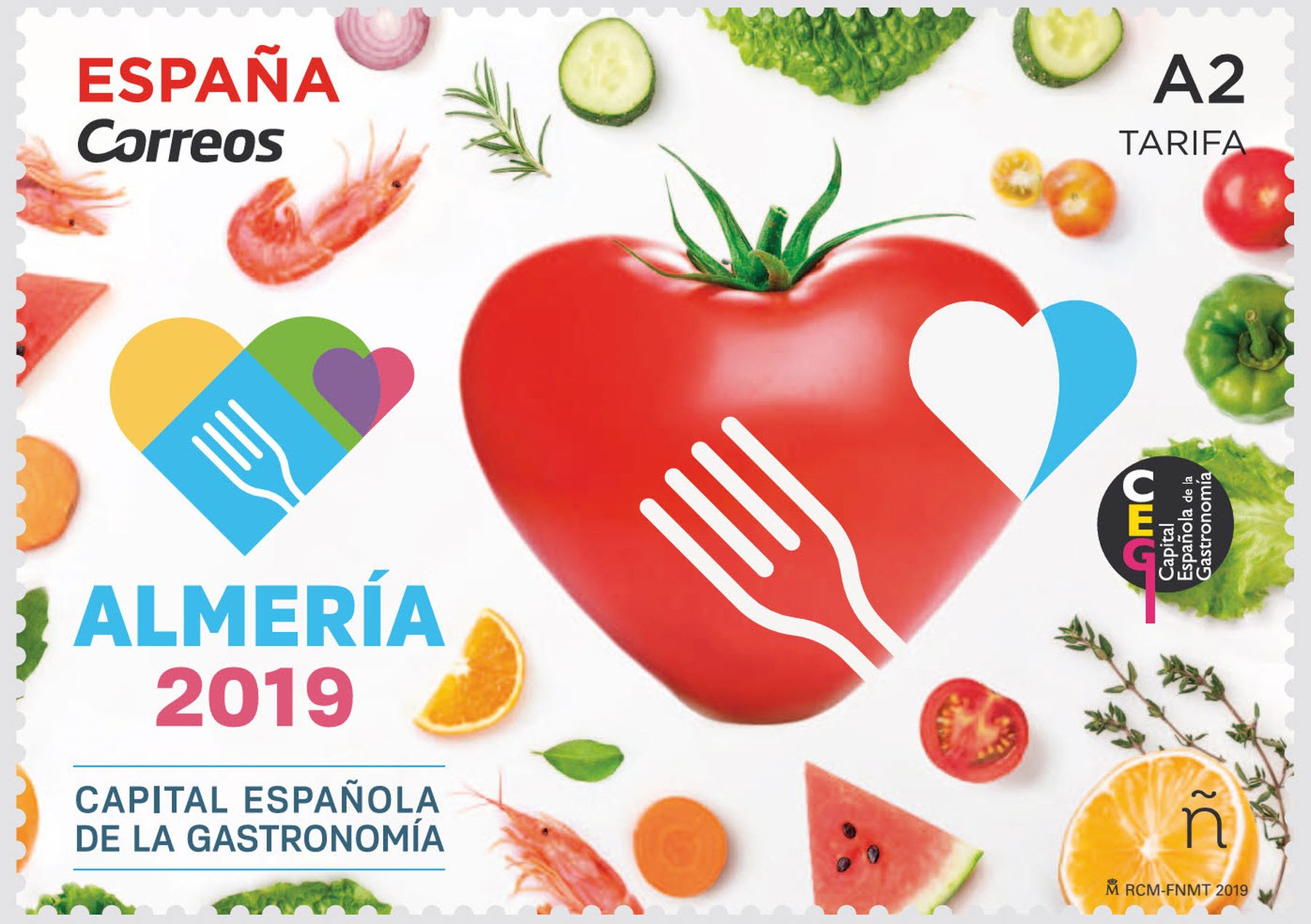 El tomate, producto estrella de la huerta almeriense, es el protagonista también de un sello repleto de imágenes de gambas, sandías y otros ingredientes que hacen a Almería digna merecedora de esta distinción.