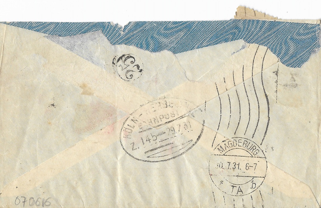Carta depositada en el Correo Central (Madrid) para su curso por vía aérea urgente a Magdeburgo con fecha 27.JUL.31 y llegada el 30.
