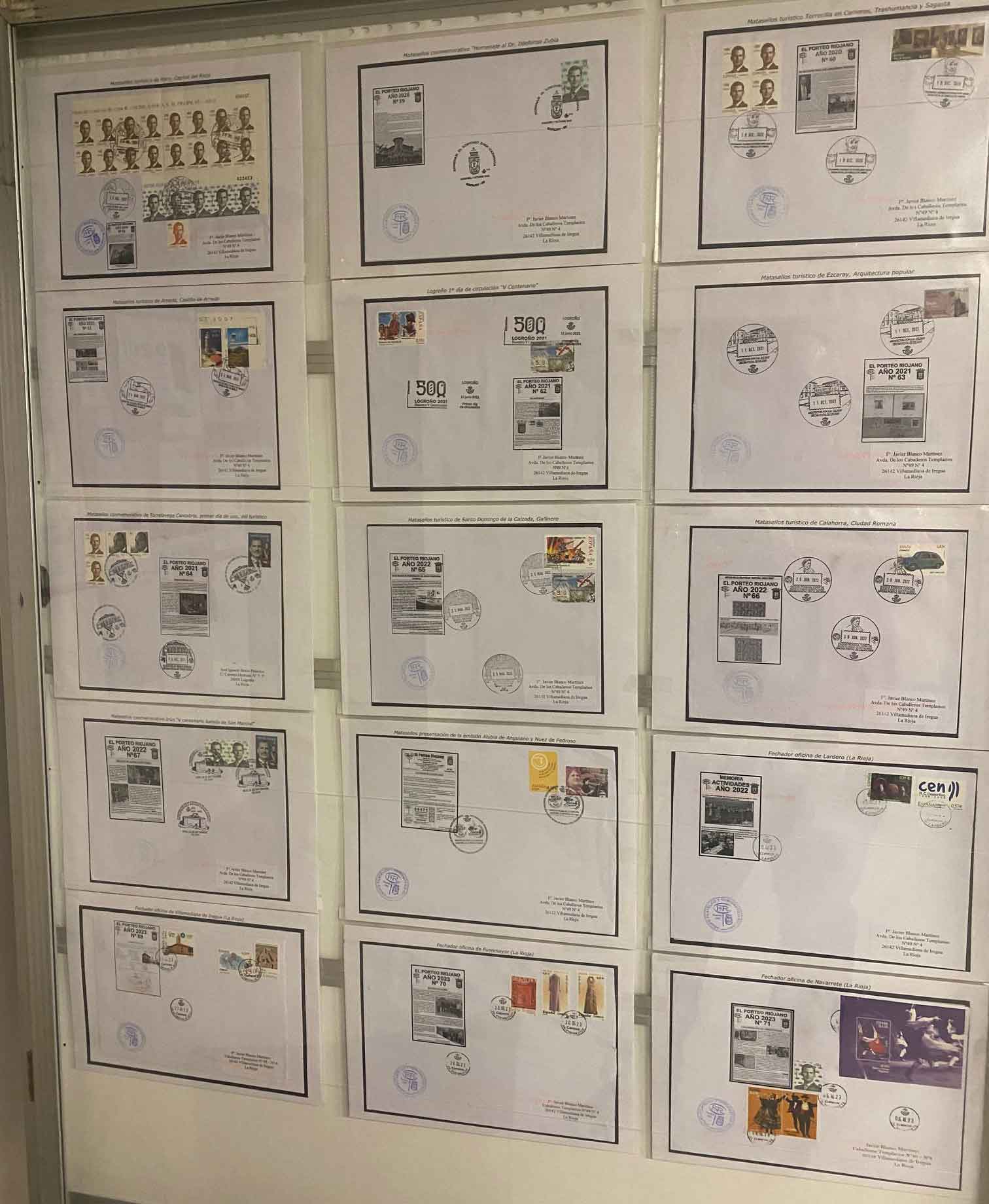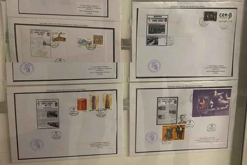 En esta ocasión contamos con dos paneles de un socio cercano a cumplir los 80 pero con muchas ganas de hacer sus pequeñas creaciones. Cada vez que hemos montado una exposición o sale un sello de Logroño este socio se encarga de realizar un montaje muy particular sin tener en cuenta tamaños comerciales o estándar. Se acerca a una tienda de fotocopias y va con su idea para que le realicen el montaje, luego va regalando las tarjetas entre sus amistades. Así es como he podido yo realizar estos dos cuadros con todo lo que me ha ido regalando a lo largo de estos años.