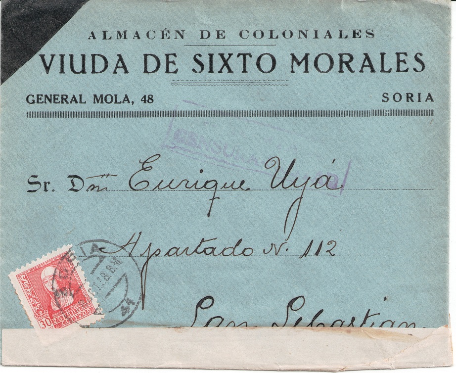lote Nº 363. 28- 21:35h. Carta comercial de luto de Soria a San Sebastián. SEMISOLIDARIO