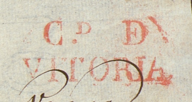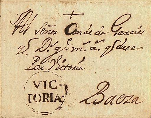 Marca “VIC-TORIA” dentro de doble circulo en carta de Legazpi a Baeza el 12 de octubre de 1.747. Legazpi sacaba su correo por Villarreal, aunque en la carta se indica “Por Vitoria”.