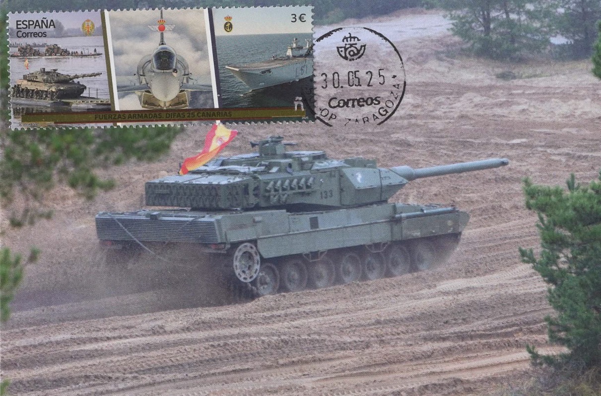 Tarjeta máxima primer día. Tanque Leopoard. Matasellada en Zaragoza, donde se encuentran varias unidades de estos tanques